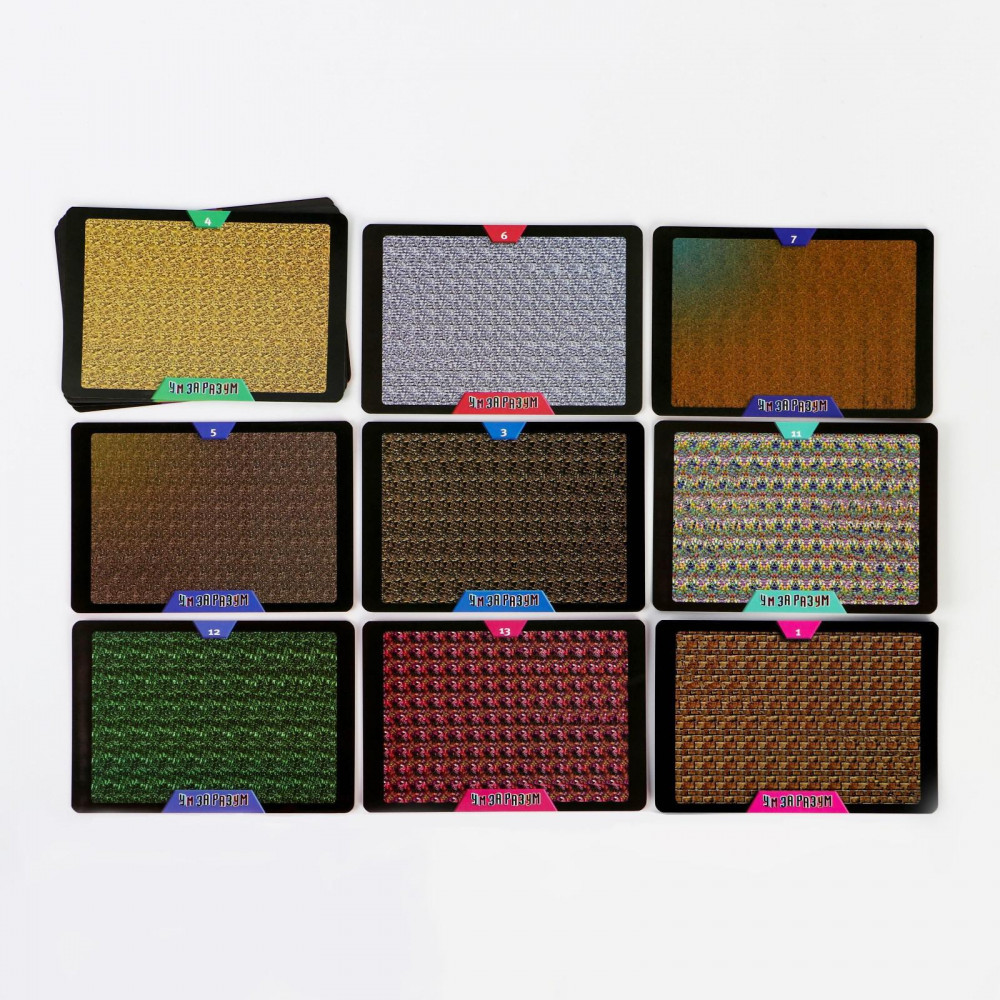 Всё просто: по очереди вытягивайте карточки и выполняйте задания за отведённое время. Тот, кто первым справится с ними, останавливает время и сверяет свой ответ с правильным. Если они совпали, то игрок забирает карточку себе в качестве победного очка. А ещё внутри вы найдете 15 карточек со стереокартинками — специальными изображениями, рассматривая которые можно увидеть 3D-картины!