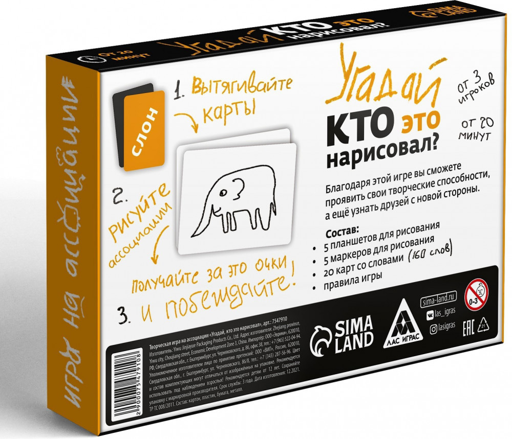 В данный момент этот товар отсутствует в продаже. Возможно, у нас найдется аналогичный или похожий товар здесь. Серия: Объясни или Покажи Благодаря этой игре вы сможете проявить свои творческие способности, а ещё узнать друзей с новой стороны. Вытягивайте карты, рисуйте ассоциации к словам и угадывайте, где чей рисунок. Получайте за это очки и побеждайте! Играйте и развивайте ассоциативное мышление!