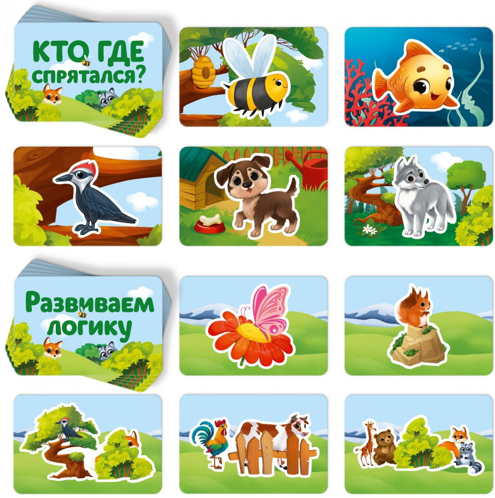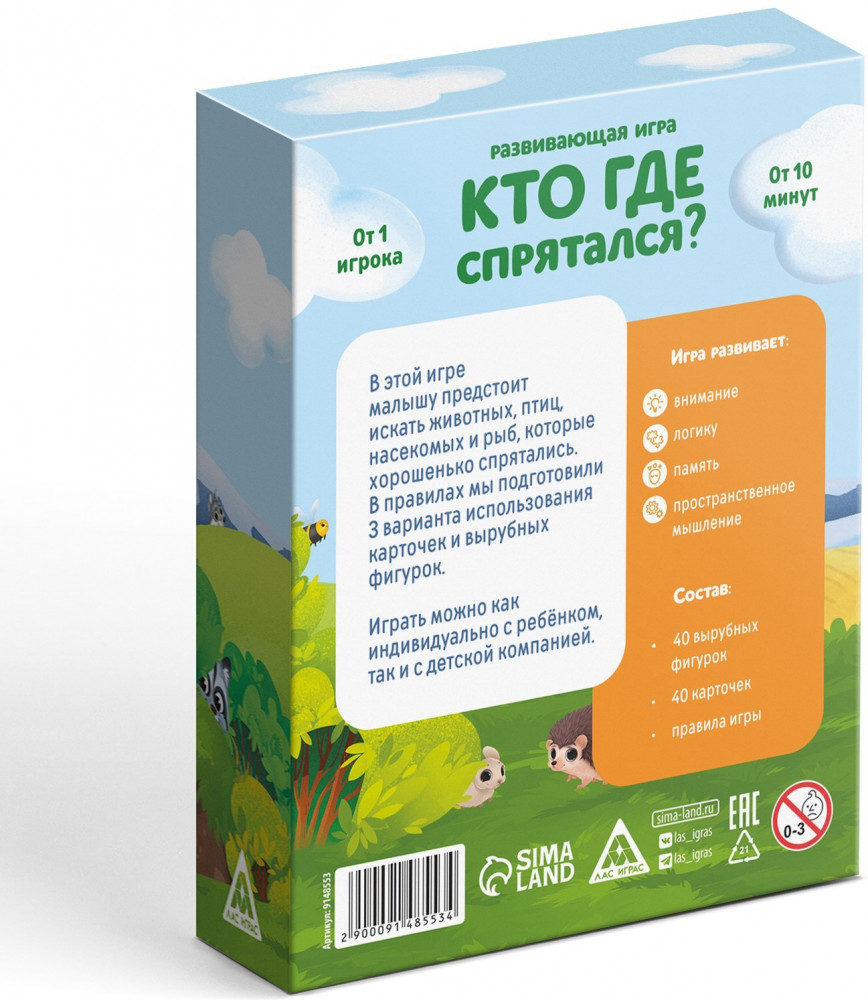 В этой игре малышу предстоит искать животных, птиц, насекомых и рыб, которые хорошенько спрятались. В правилах мы подготовили 3 варианта использования карточек и вырубных фигурок. Играть можно как индивидуально с ребёнком, так и с детской компанией.