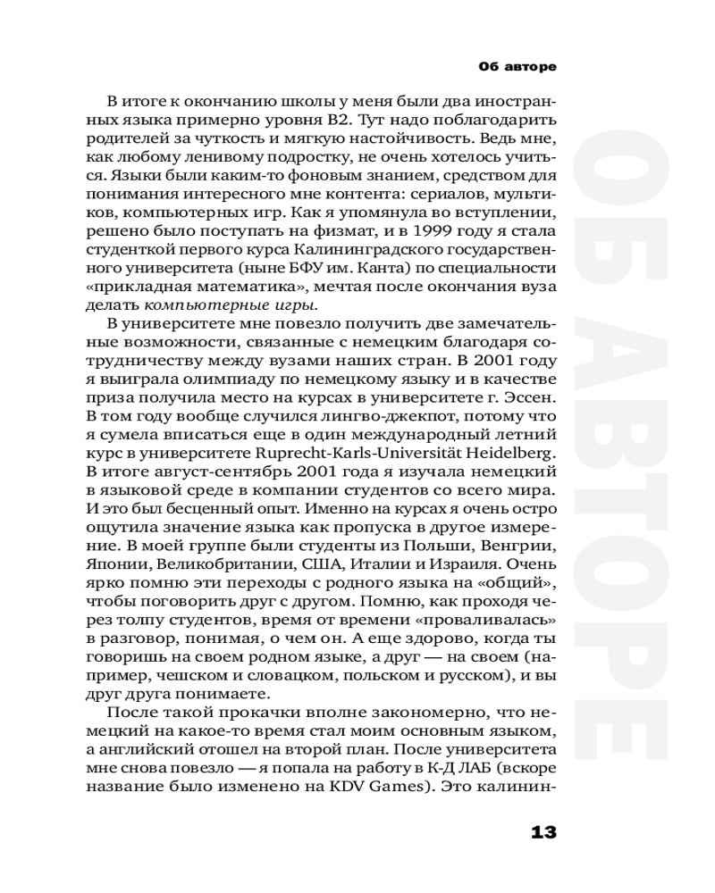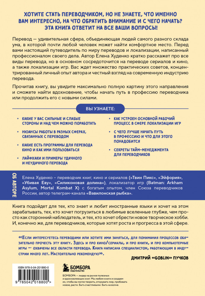💳 Оплатить за товар можно при получении 🇰🇿 Есть бесплатная доставка по Казахстану от 1 дня 🎁 Копите бонусы с каждой покупки Серия: Российский компьютерный бестселлер. Гейм-дизайн Перевод — удивительная сфера, объединяющая людей самого разного склада ума, в которой почти любой человек может найти комфортное место. Перед вами настоящий путеводитель по миру переводов и локализации, написанный профессионалом своего дела. Автор Елена Худенко кратко расскажет про все виды перевода, но в основном сосредоточится на переводе сериалов и кино, а также локализации игр. Вас ждет множество практических советов, концентрированный личный опыт автора и честный взгляд на современную индустрию перевода. |