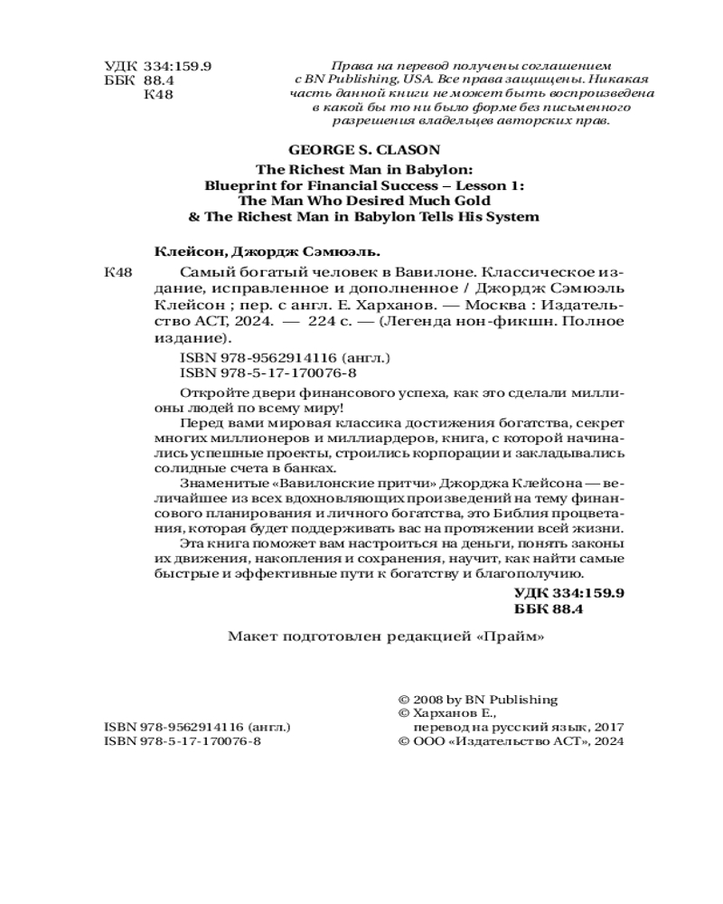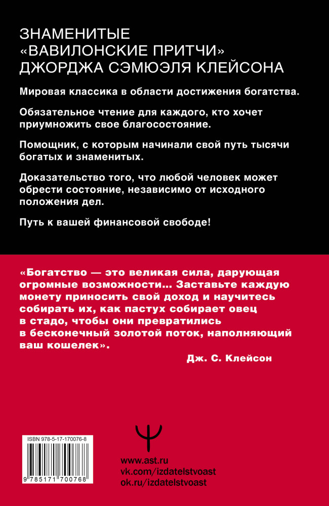 💳 Оплатить за товар можно при получении 🇰🇿 Есть бесплатная доставка по Казахстану от 1 дня 🎁 Копите бонусы с каждой покупки Серия: Легенда нон-фикшн. Полное издание Перед вами — мировая классика в области достижения богатства. Обязательна к прочтению для каждого, кто хочет приумножить свое благосостояние. Помощник, с которым начинали свой путь тысячи богатых и знаменитых. Знаменитые «Вавилонские притчи» Джорджа Клейсона — величайшее из всех вдохновляющих произведений на тему финансового планирования и личного богатства, это Библия процветания, которая будет поддерживать вас на протяжении всей жизни. Эта книга — путь к вашей финансовой свободе! |