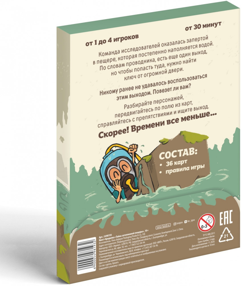 В данный момент этот товар отсутствует в продаже. Возможно, у нас найдется аналогичный или похожий товар здесь. Серия: Квест Узнайте тайну затопленной пещеры. Команда исследователей оказалась запертой в пещере, которая постепенно наполняется водой. По словам проводника, есть ещё один выход, но чтобы попасть туда, нужно найти ключ от огромной двери. Никому ранее не удавалось воспользоваться этим выходом. Повезёт ли вам? Разбирайте персонажей, передвигайтесь по полю из карт, справляйтесь с препятствиями и ищите выход. Скорее! Времени всё меньше...