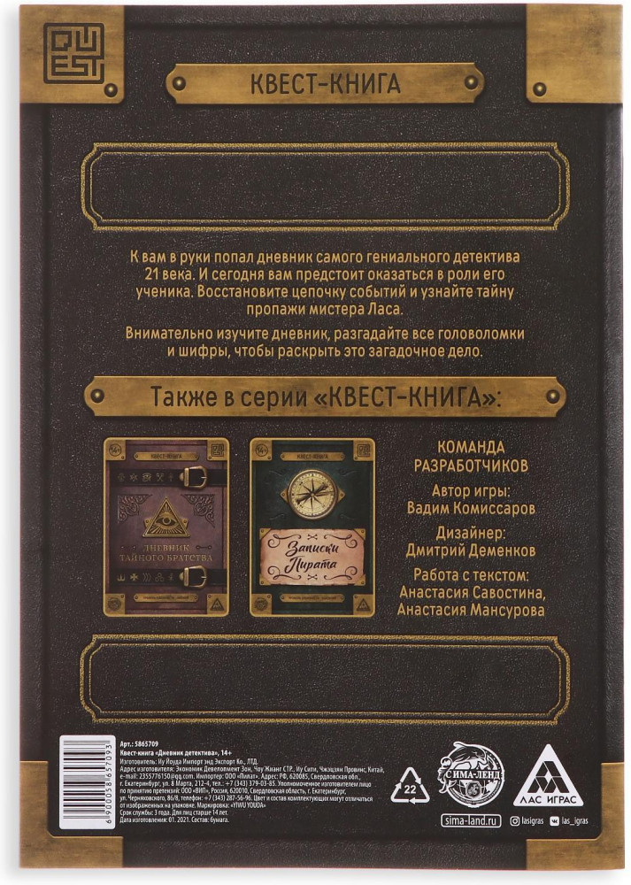 💳 Оплатить за товар можно при получении 🇰🇿 Есть бесплатная доставка по Казахстану от 1 дня 🎁 Копите бонусы с каждой покупки Серия: Квест Выясните, куда пропал Мистер ЛАС! У вас в руках дневник самого гениального детектива XXI века. И вам предстоит оказаться в роли его ученика. Восстановите цепочку событий и узнайте тайну пропажи Мистера ЛАСа. Внимательно изучите книгу, разгадайте все головоломки и шифры, чтобы раскрыть это загадочное дело. |