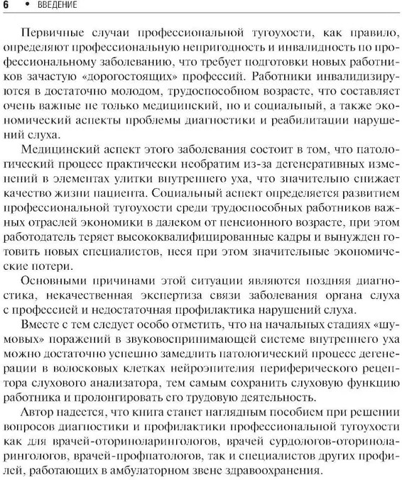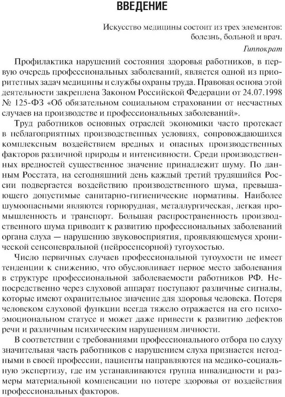 В книге изложены клинико-патогенетические особенности возникновения, течения и классификации профессиональной нейросенсорной (сенсоневральной) тугоухости, критерии допуска к профессиональной деятельности по слуху как только поступающих, так и уже работающих в шумоопасной профессии, а также вопросы диагностики, экспертизы связи заболеваний с профессией, профпригодности и профилактики потерь слуха от воздействия шума.