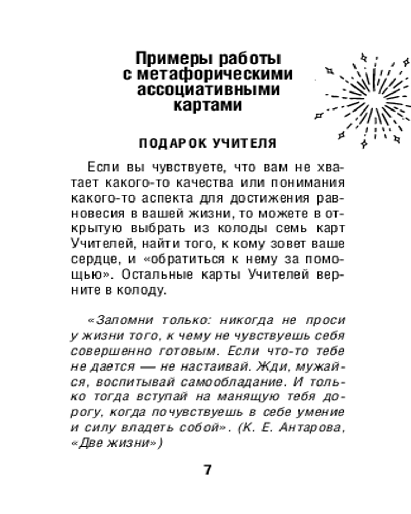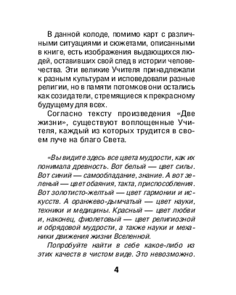 💳 Оплатить за товар можно при получении 🇰🇿 Есть бесплатная доставка по Казахстану от 1 дня 🎁 Копите бонусы с каждой покупки Серия: Тайны знания. Трансформационные игры Колода создана на основе романа Коры Антаровой «Две жизни», главные герои которого — великие души, завершившие эволюцию на земле, но оставшиеся, чтобы помогать другим людям в их духовном восхождении. Помимо карт с различными ситуациями и сюжетами, описанными в книге, здесь есть изображения выдающихся людей, оставивших свой след в истории человечества. Принцип взаимодействия с метафорическими картами позволяет обратиться к творческому началу и понять, что скрыто в бессознательном. Карты подходят как для психологического консультирования, так и для самостоятельной работы. |
