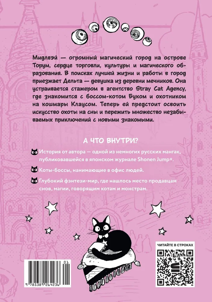 💳 Оплатить за товар можно при получении 🇰🇿 Есть бесплатная доставка по Казахстану от 1 дня 🎁 Копите бонусы с каждой покупки Мидлвэй — огромный магический город на острове Торум, сердце торговли, культуры и магического образования. В поисках лучшей жизни и работы в город приезжает Дельта — девушка из деревни мечников. Она устраивается стажером в агентство Stray Cat Agency, где знакомится с боссом-котом Буком и охотником на кошмары Клаусом. Теперь ей предстоит освоить искусство охоты на сны и пережить множество незабываемых приключений с новыми знакомыми. |