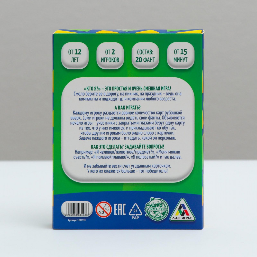 💳 Оплатить за товар можно при получении 🇰🇿 Есть бесплатная доставка по Казахстану от 1 дня 🎁 Копите бонусы с каждой покупки Примеряем роль... единорога! «Кто я?» — это простая и забавная игра! Смело берите её в дорогу, на пикник или праздник: она компактна и подходит для компании любого возраста. Устраиваем допрос с пристрастием. У каждого окажется карточка с именем персонажа — приложите её ко лбу, но сами не подсматривайте, ведь вам предстоит угадать, что на ней написано! А сделать это очень просто: задавайте вопросы о себе по очереди. Например: «Я человек/животное/предмет?», «Меня можно съесть?», «Я ползаю/плаваю?», «Я полосатый?» и другие. Внутри целых 20 карточек. И не забывайте вести счёт угаданным карточкам — у кого их окажется больше, тот победил! Внутри вы найдете: 20 карточек с фантами. Друзья будут в восторге! |