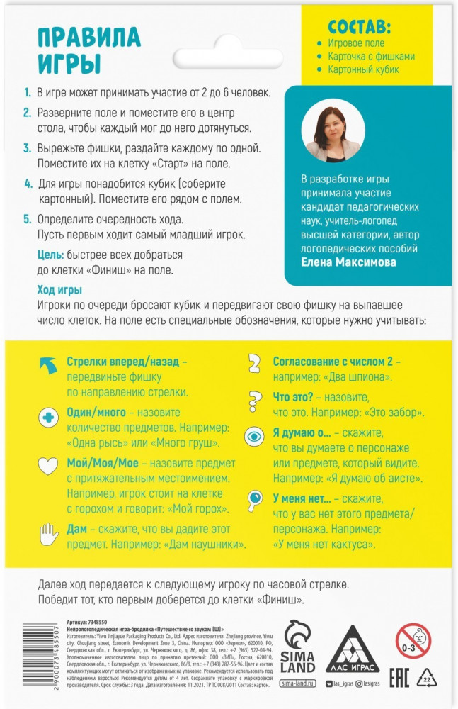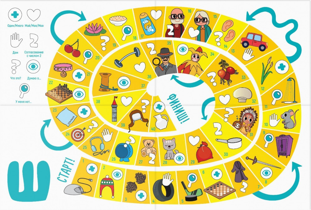 💳 Оплатить за товар можно при получении 🇰🇿 Есть бесплатная доставка по Казахстану от 1 дня 🎁 Копите бонусы с каждой покупки Серия: Логопедические игры Перед вами не просто весёлая игра-бродилка. Это полезное пособие, которое поможет автоматизировать и закрепить произношение звука [Ш] в начале, середине и конце слова. Маленьким участникам предстоит передвигаться по игровому полю и выполнять разные задания. Как играть? Разверните поле и поместите его в центр стола, чтобы все могли дотянуться. Вырежьте фишки и раздайте каждому по одной. Положите их на клетку «Старт» на поле. Для игры понадобится кубик (в комплект входит развёртка). Задача участников: быстрее остальных добраться до финиша. Игроки по очереди бросают кубик и передвигают свою фишку на выпавшее число клеток. На поле есть специальные обозначения, их нужно учитывать и выполнять задания. Например, назвать, какое количество предметов нарисовано на поле. Или назвать цвет предмета, его размер, и так далее. Затем ход переходит к следующему игроку по часовой стрелке. Побеждает тот, кто первым доберётся до клетки "Финиш". |