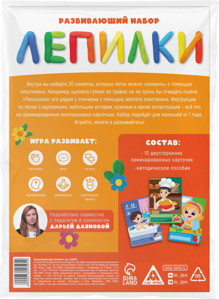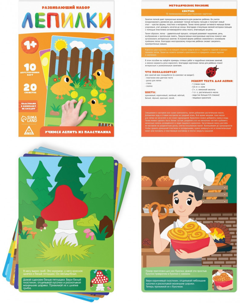 💳 Оплатить за товар можно при получении 🇰🇿 Есть бесплатная доставка по Казахстану от 1 дня 🎁 Копите бонусы с каждой покупки Серия: Мелкая моторика Внутри набора вы найдёте 20 сюжетов, которые легко можно оживить с помощью пластилина. Например, цыплята гуляют по травке и не прочь бы отведать пшена. Предложите ребёнку «рассыпать» его рядом с птичками с помощью жёлтого пластилина. Инструкции по лепке с картинками, небольшие истории, крупные и яркие иллюстрации — всё это есть на ламинированных многоразовых карточках. Набор подойдёт для малышей от 1 года. |
