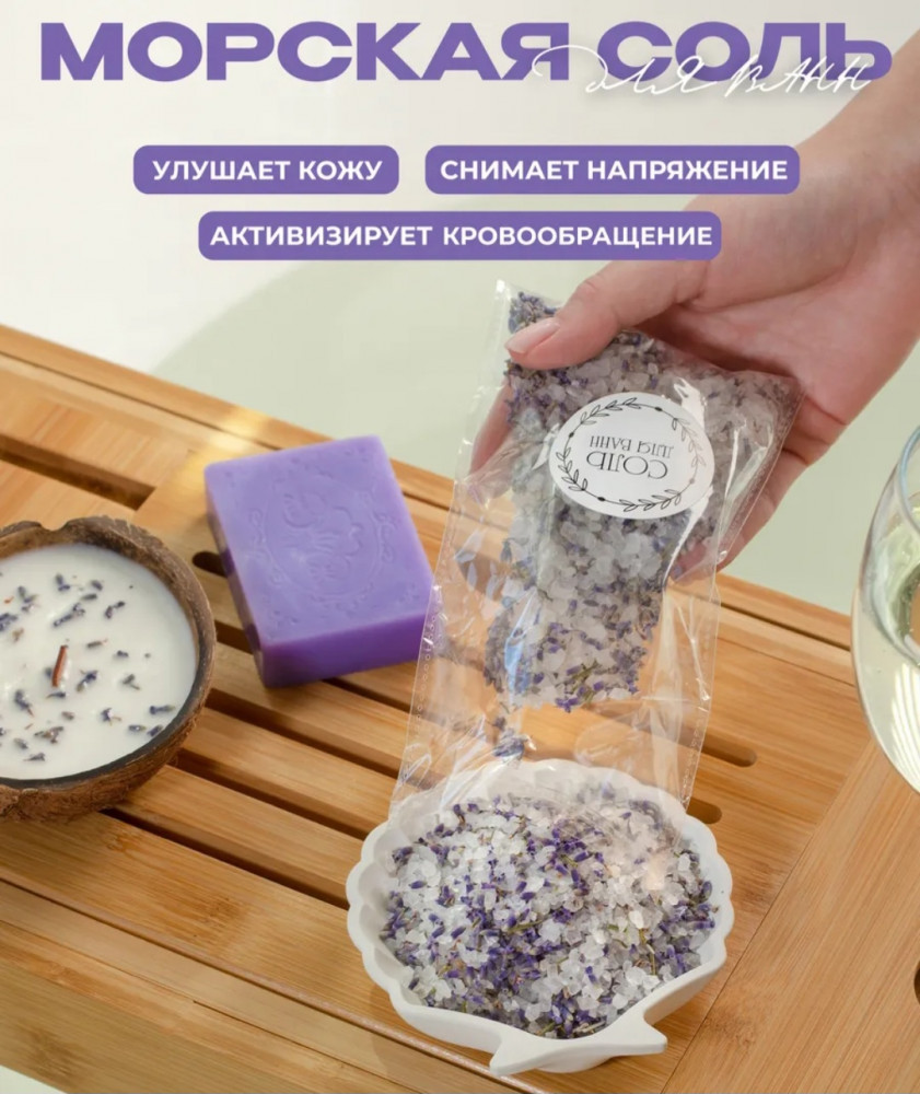 • соль для ванн с лавандой: расслабляющая добавка для ванны, обогащенная натуральными эфирными маслами и сушеными цветами лаванды, снимает усталость и наполняет кожу мягкостью;