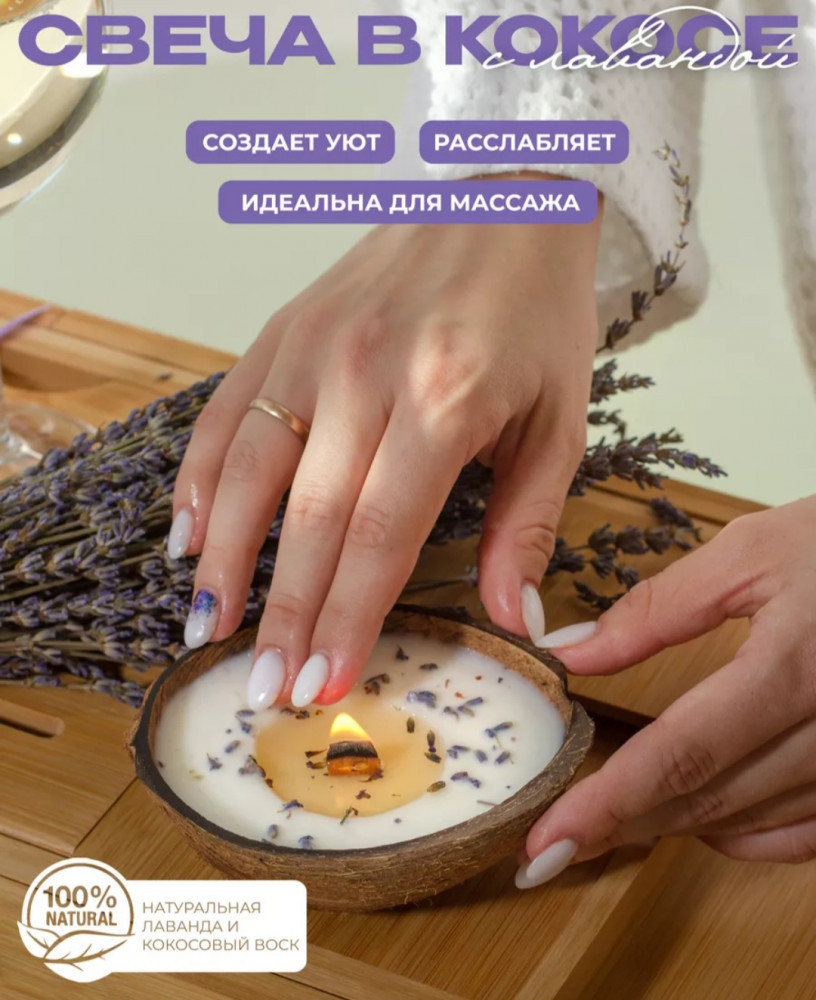 • натуральная массажная свеча в кокосе: создана из экологически чистых компонентов, свеча тает при горении, превращаясь в теплое массажное масло с нежным ароматом;