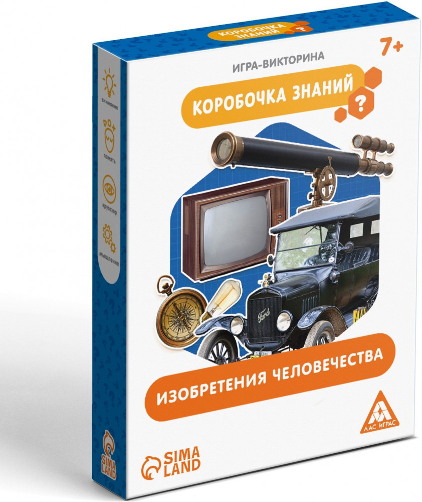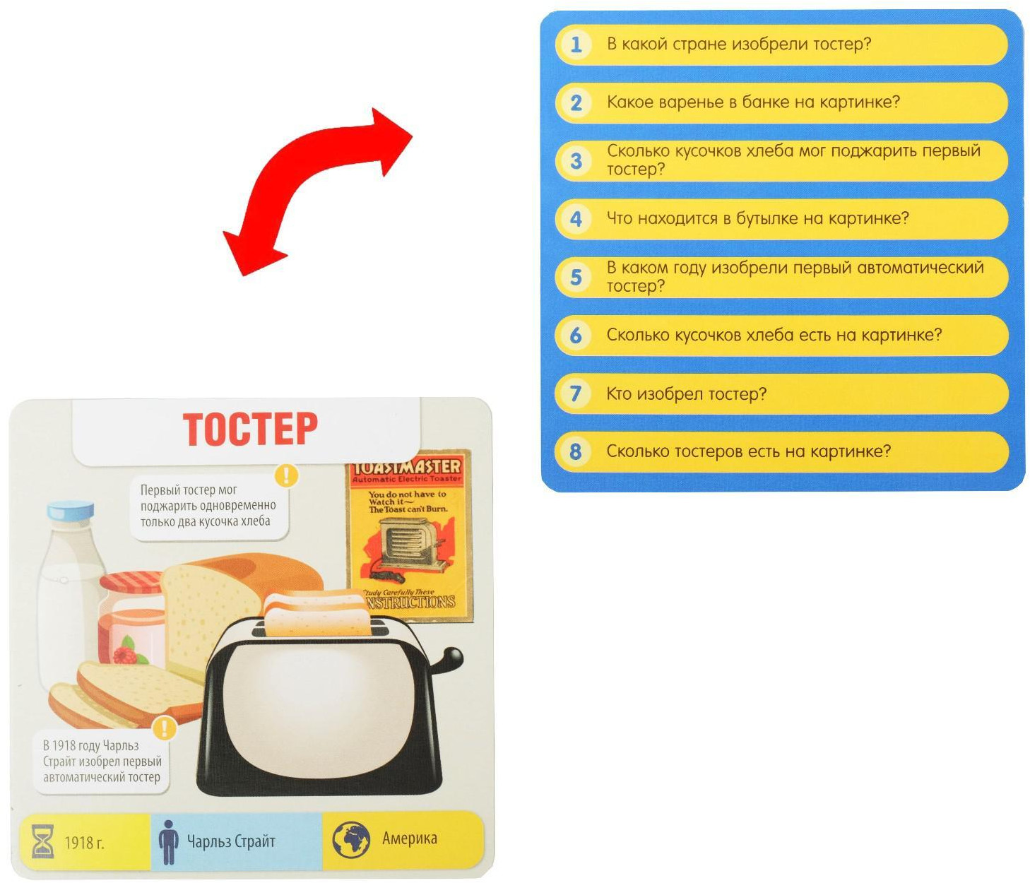 Новое открытие на каждой карточке. В наборе вы найдёте 50 карточек. На каждой из них нарисовано изобретение, а также указана краткая информация о нём: дата появления и некоторые интересные факты . Изучив карточку в течение 15 секунд, киньте кубик, а цифра вам укажет на номер задания. Все вопросы находятся на обороте карточек и относятся не только к цифрам и фактам, но ещё и к самому изображению. Тот игрок, кому удалось верно ответить на вопрос, забирает карточку себе, а побеждает самый внимательный участник, набравший больше всех карт!