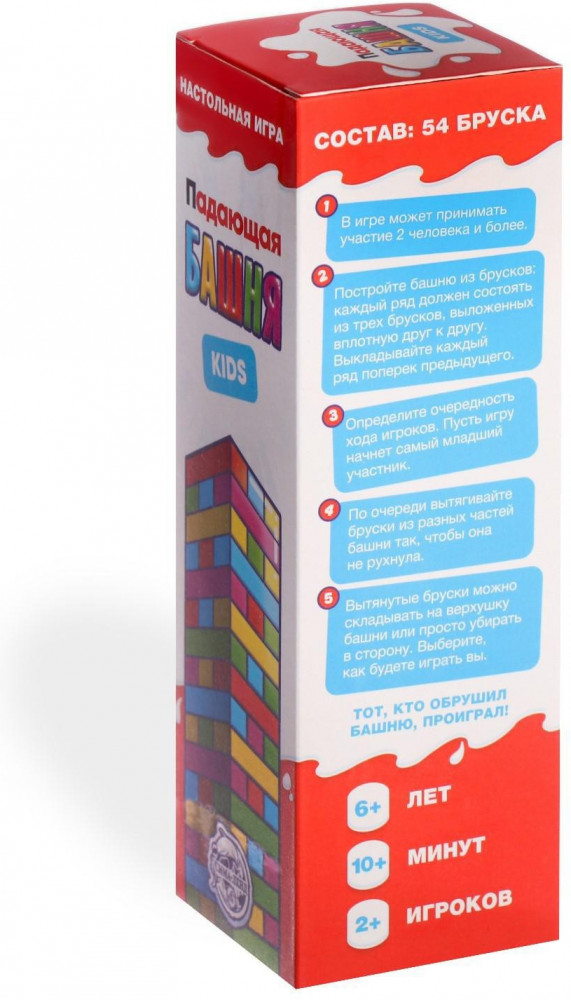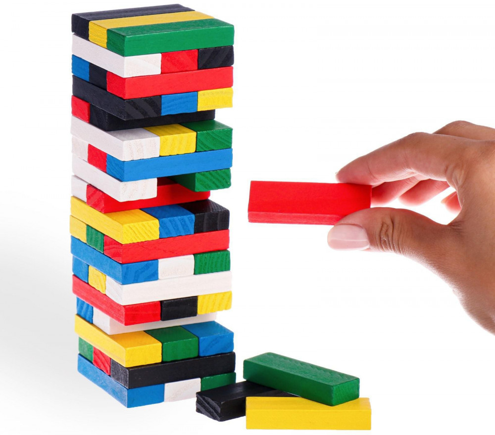 Как играть? постройте башню: каждый ряд состоит из 3 брусков, выложенных вплотную друг к другу. Каждый новый должен располагаться поперёк предыдущего. По очереди вытягивайте деревяшки из разных частей башни так, чтобы она не рухнула. Вытянутые бруски можно складывать на верхушку башни или просто убирать в сторону. Выберите, как будете играть вы. Тот, кто обрушил башню, проиграл!