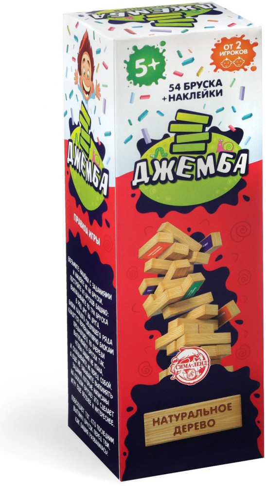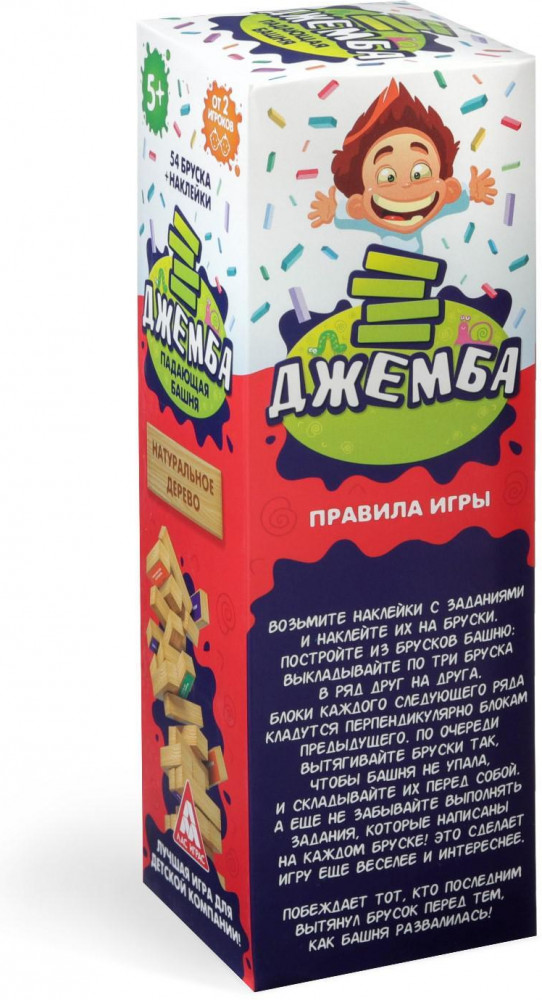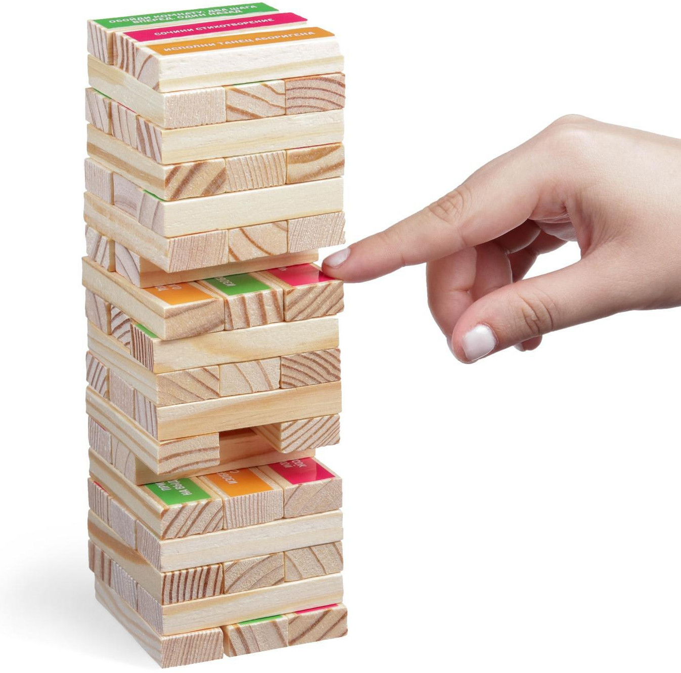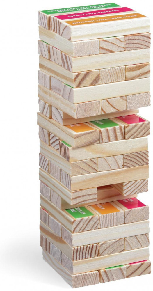 Возьмите наклейки с заданиями и наклейте их на бруски. Постройте из брусков башню: выкладывайте по три бруска в ряд друг на друга. Блоки каждого следующего ряда кладутся перпендикулярно блокам предыдущего. По очереди вытягивайте бруски так, чтобы башня не упала, и складывайте их перед собой. А еще не забывайте выполнять задания, которые написаны на каждом бруске! Это сделает игру еще веселее и интереснее. Побеждает тот, кто последним вытянул брусок перед тем, как башня развалилась!