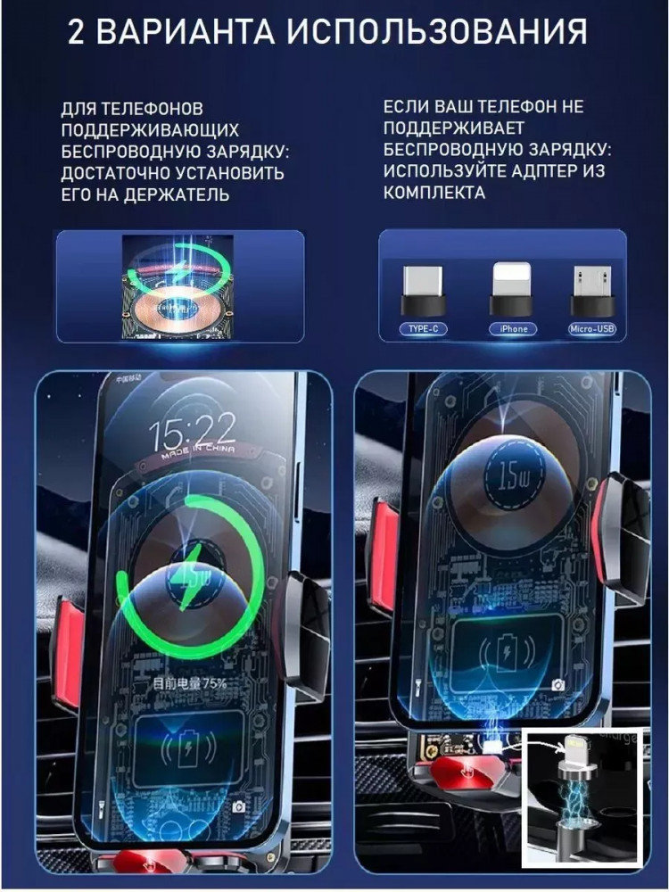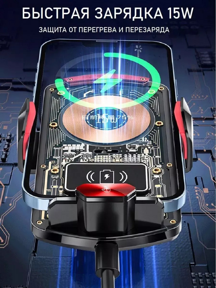 Уникальный автомобильный держатель для телефона с функцией беспроводной зарядки — это инновационное решение для современных водителей. Этот аксессуар обеспечивает надежную фиксацию вашего устройства, позволяя удобно пользоваться навигацией и принимать звонки, не отвлекаясь от управления. Благодаря передовой технологии беспроводной зарядки вы можете забыть о проводах и разряженной батарее: просто поместите телефон в держатель, и зарядка начнется автоматически.