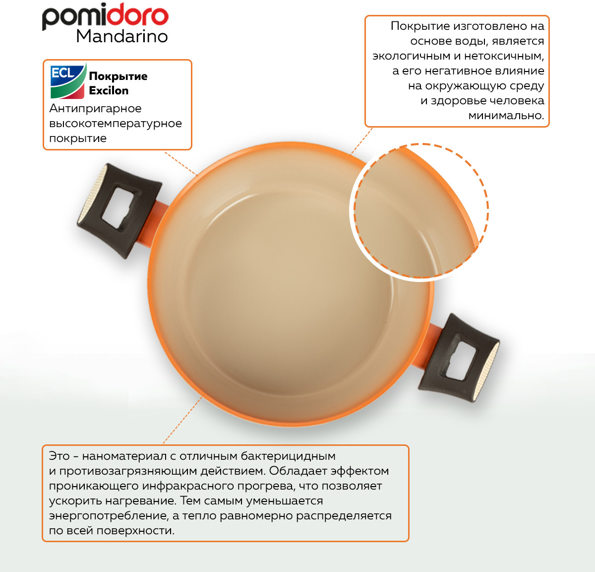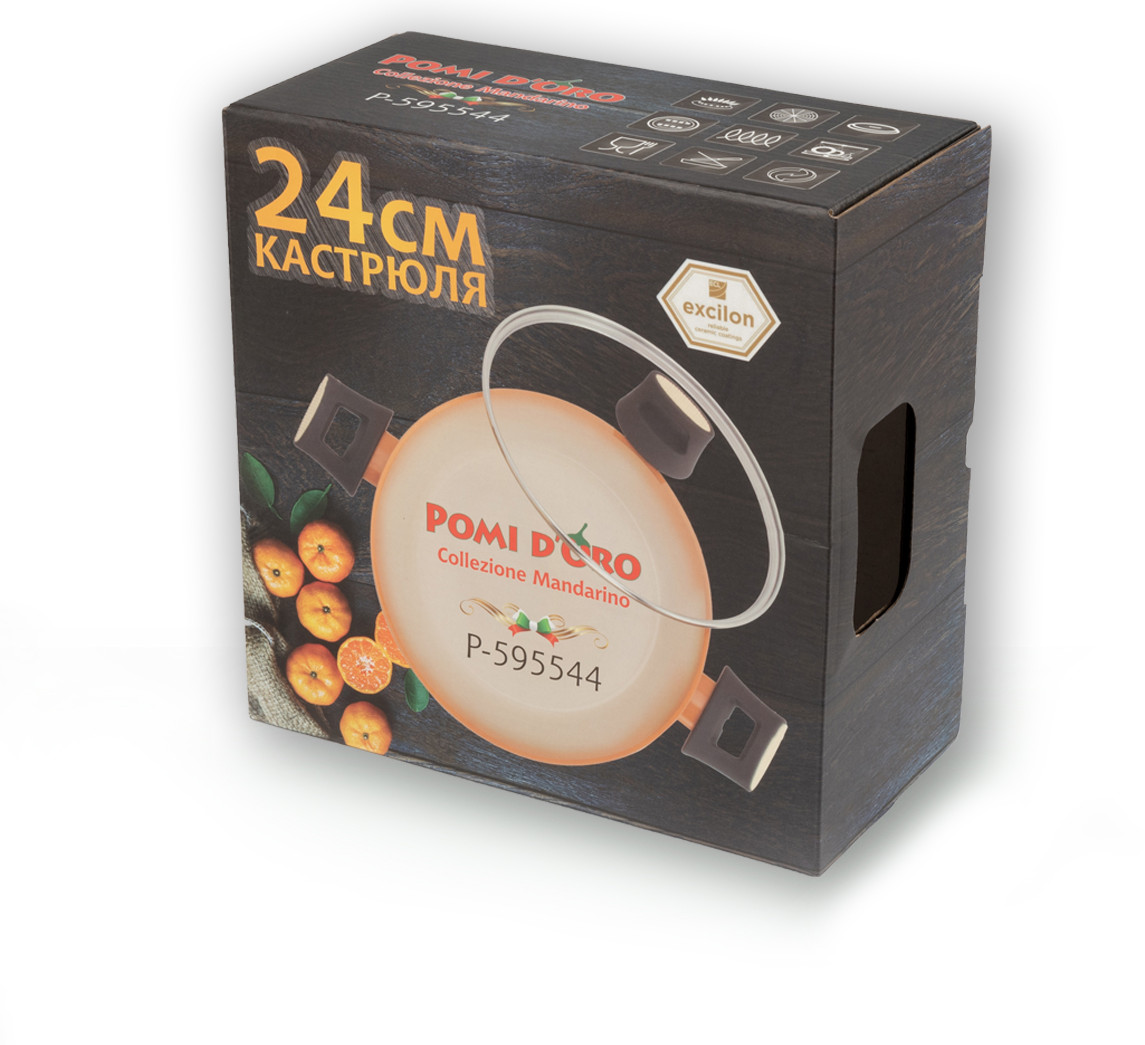 💳 Оплатить за товар можно при получении 🇰🇿 Есть бесплатная доставка по Казахстану 🎁 Копите бонусы с каждой покупки Серия: Mandarino Кастрюля диаметром 24 см. Коллекция Mandarino. Excilon — это особое высококачественное высокотемпературное керамическое антипригарное покрытие для посуды.. Покрытие изготовлено на основе воды, является экологичным и нетоксичным, а его негативное влияние на окружающую среду и здоровье человека минимально. Это — наноматериал с отличным бактерицидным и противозагрязняющим действием. Обладает эффектом проникающего инфракрасного прогрева, что позволяет ускорить нагревание. Тем самым уменьшается энергопотребление, а тепло равномерно распределяется по всей поверхности. Технология нанесения при низких температурах эффективно защищает материала, на который нанесено данное покрытие.. В такой посуде можно готовить здоровую пищу с использованием минимального количества жира. В ней можно тушить, жарить, варить — любые блюда от незатейливых соусов до сочных бифштексов с хрустящей корочкой. Кухонная посуда с покрытием Excilon подойдет для любых видов плит, в том числе и индукционных. |
