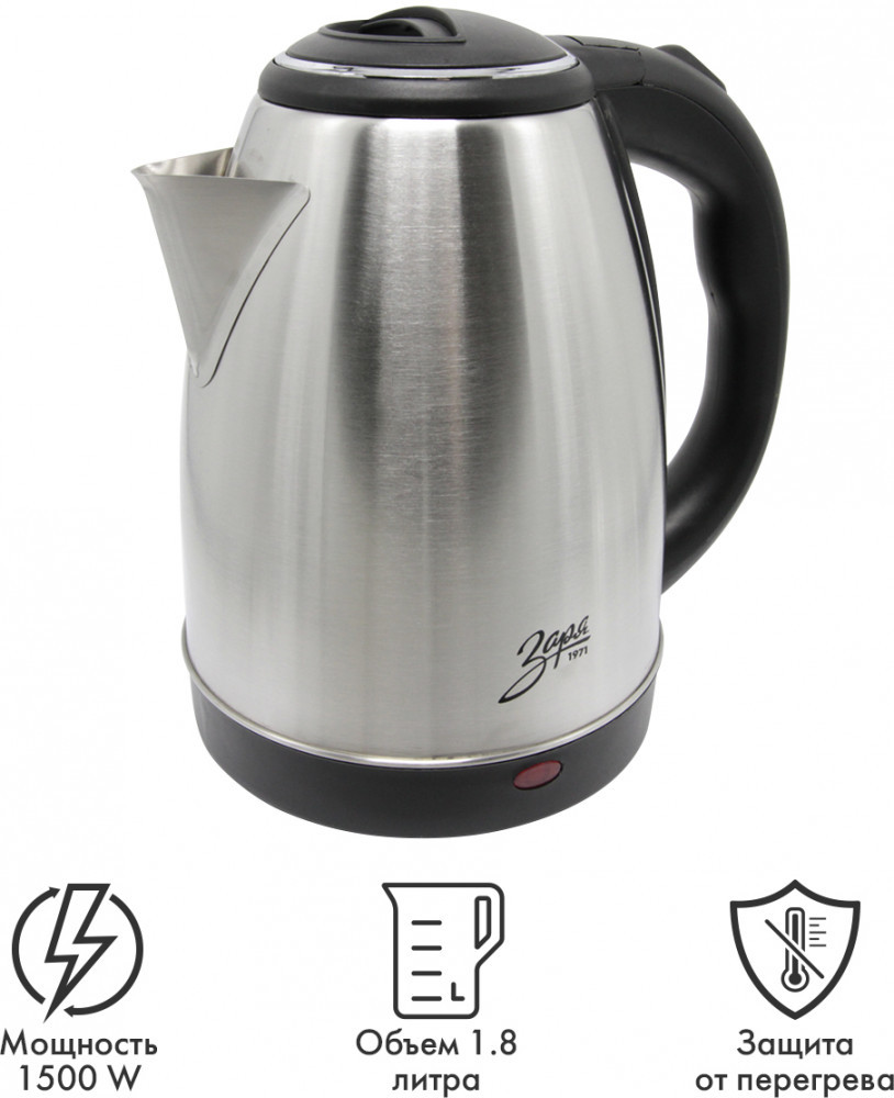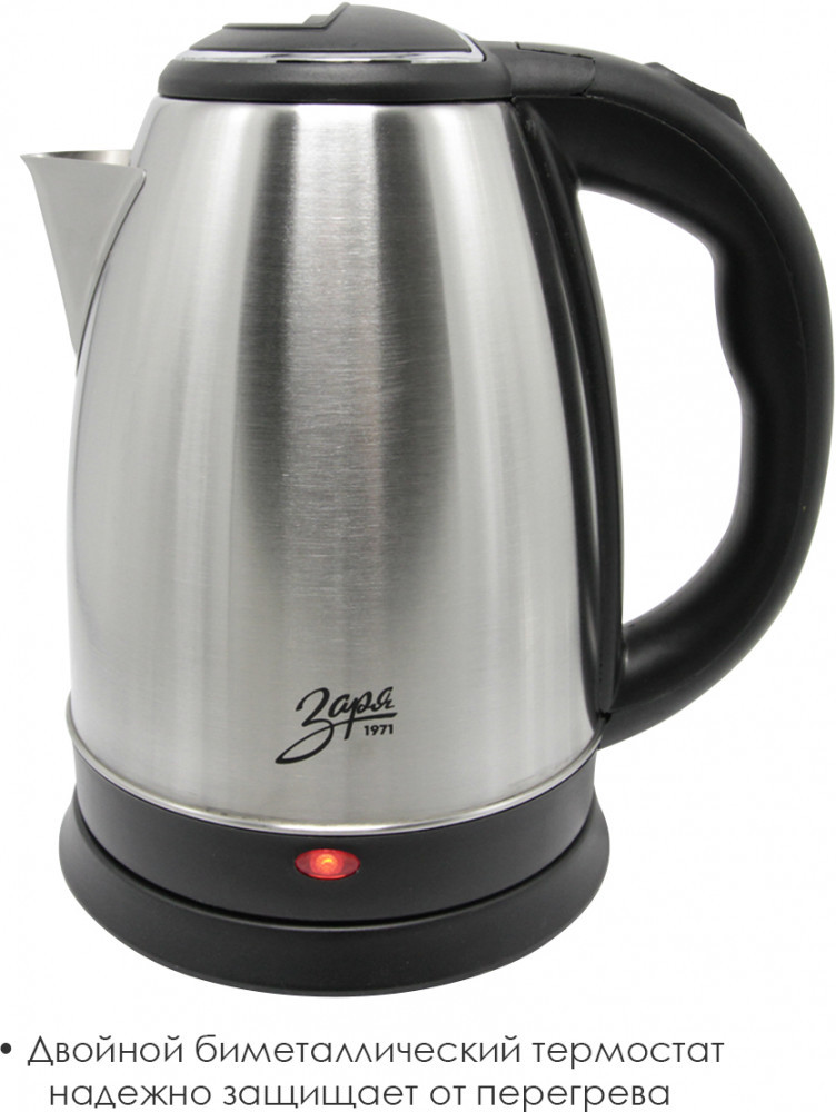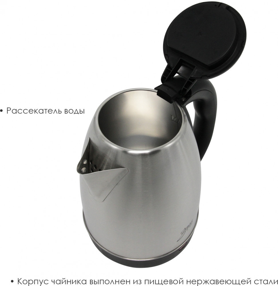 Дизайн чайника разработан с учетом современных тенденций в области кухонного интерьера. Прекрасно сочетается со стилем модерн и классическим интерьером с использованием натурального дерева. Корпус чайника и нагревательный элемент выполнен полностью из пищевой нержавеющей стали. В данном чайнике используется дисковый нагревательный элемент, это позволяет вскипятить быстро небольшое количество воды. Сам нагревательный элемент так же изготовлен из высокопрочной стали, что позволяет его чистить от накипи обычной щеткой. Материалы используемые в изделии подобраны с заботой о Вашем здоровье и не выделяют никаких вредный веществ.