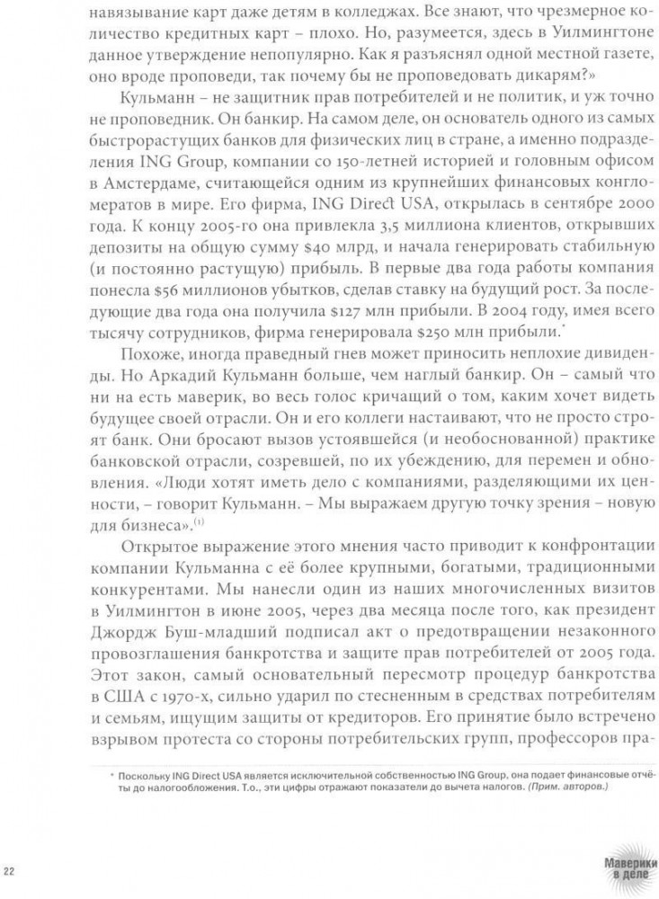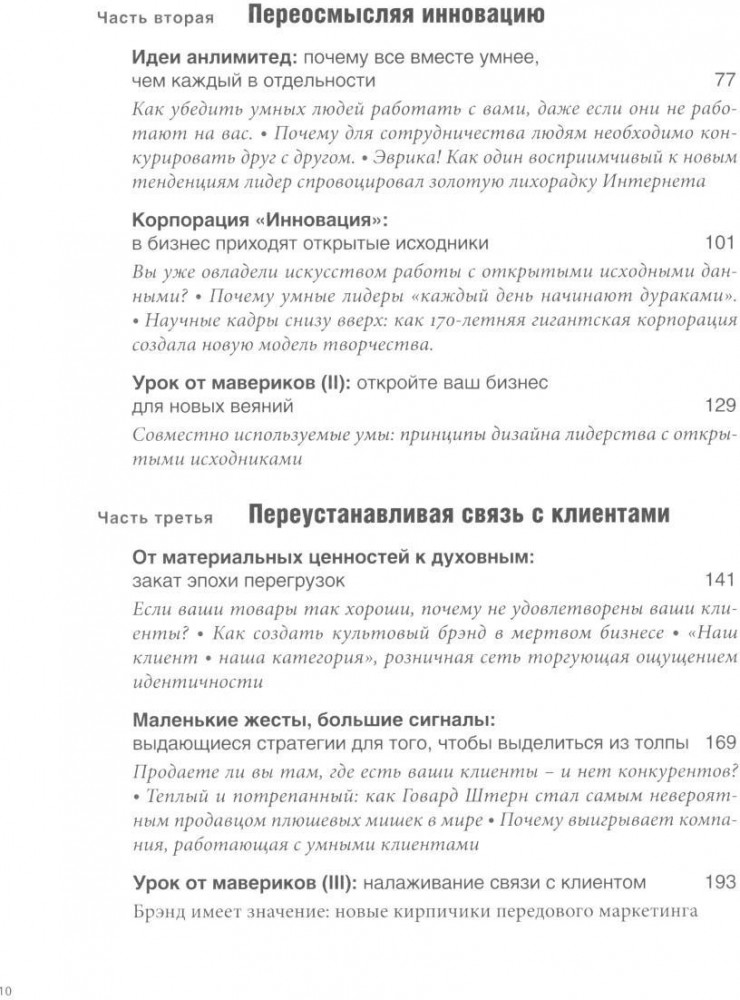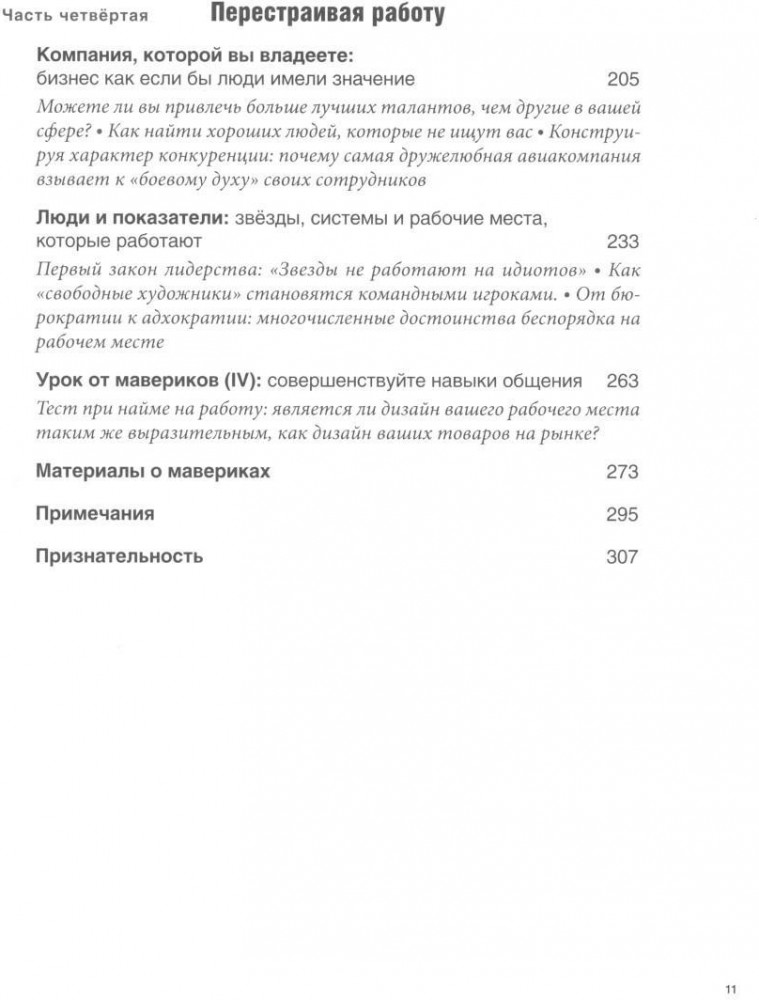 Позвольте представить вам новаторов и выскочек, придумывающих будущее бизнеса уже сегодня. Их нестандартные идеи и революционные стратегии могут стать вашим бизнес-планом на двадцать первый век — лучшим способом руководить, конкурировать и достигать успеха. Бизнес в его обычном понимании зашел в тупик. Сокращается число представителей старой гвардии и занимаемых ими территорий. Между тем организации, от которых некогда отмахивались как от неизвестных и непредсказуемых выскочек — или мавериков, — быстро разрастаются и меняют ситуацию на рынке. Этому есть объяснение. В век гиперконкуренции и непрерывного обновления единственный способ выделиться из толпы — это представлять собой нечто по-настоящему оригинальное. Таков урок, который преподают нам компании, руководители и предприниматели, упоминаемые на страницах «Мавериков в деле». Они добиваются громких побед в бизнесе, потому что переосмысляют его. Они придумали новые интересные решения извечных проблем, с которыми сталкиваются организации любого размера и лидеры в любой отрасли: как разработать стратегию, генерировать новые идеи, устанавливать связь с клиентами, как добиться лучших результатов от лучших людей. Кто эти маверики? Подрывающие устои подразделения гигантов вроде IBM или Procter & Gamble или выдающиеся компании-новаторы, подобные HBO и Pixar. Интернет-банки и золотодобывающие компании, продавцы модной одежды и рекламные агентства, нестандартные сэндвичные кафе и многообещающие программисты. Все вместе они создают захватывающий план действий, которым может воспользоваться любая фирма.