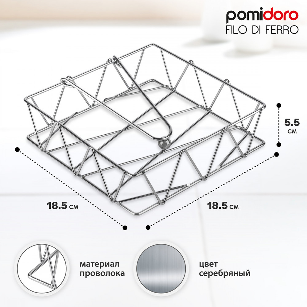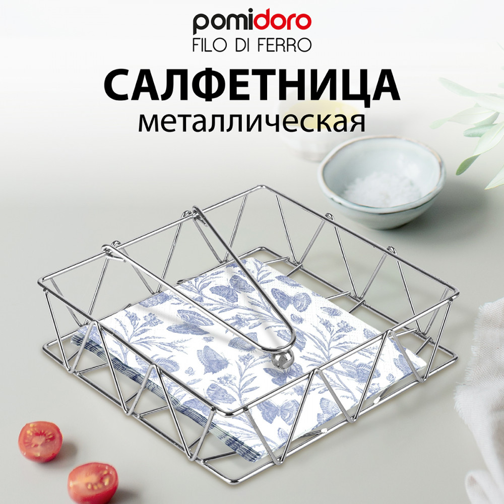 Pomi d’Oro Салфетница «Filo di ferro»В данный момент этот товар отсутствует в продаже. Возможно, у нас найдется аналогичный или похожий товар здесь. Серия: Filo di ferro Удобная и функциональная салфетница для повседневной сервировки. Предназначена для аккуратного хранения салфеток, упрощая их подачу и делая повседневную сервировку более организованной. Салфетница поможет в организации пространства и станет декором в интерьере кухни или столовой. |