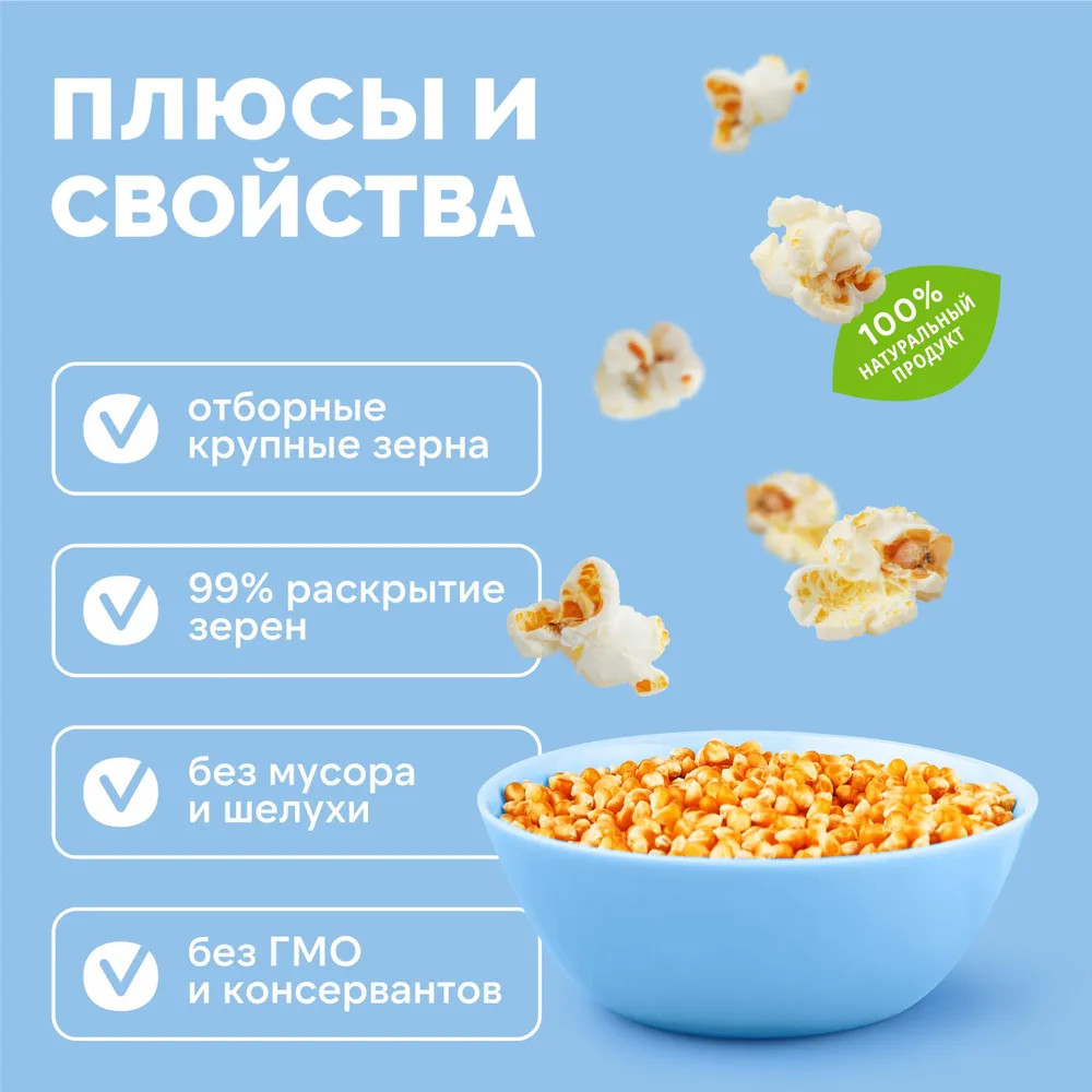 Крупное премиальное зерно кукурузы сорта «Бабочка» для приготовления попкорна. Можно готовить в домашних условиях как в микроволновой печи, так и на сковороде или специальных домашних попкорн-аппаратах. Зерна используются в качестве снека без глютена и отлично подходит как полезные сладости для детей.