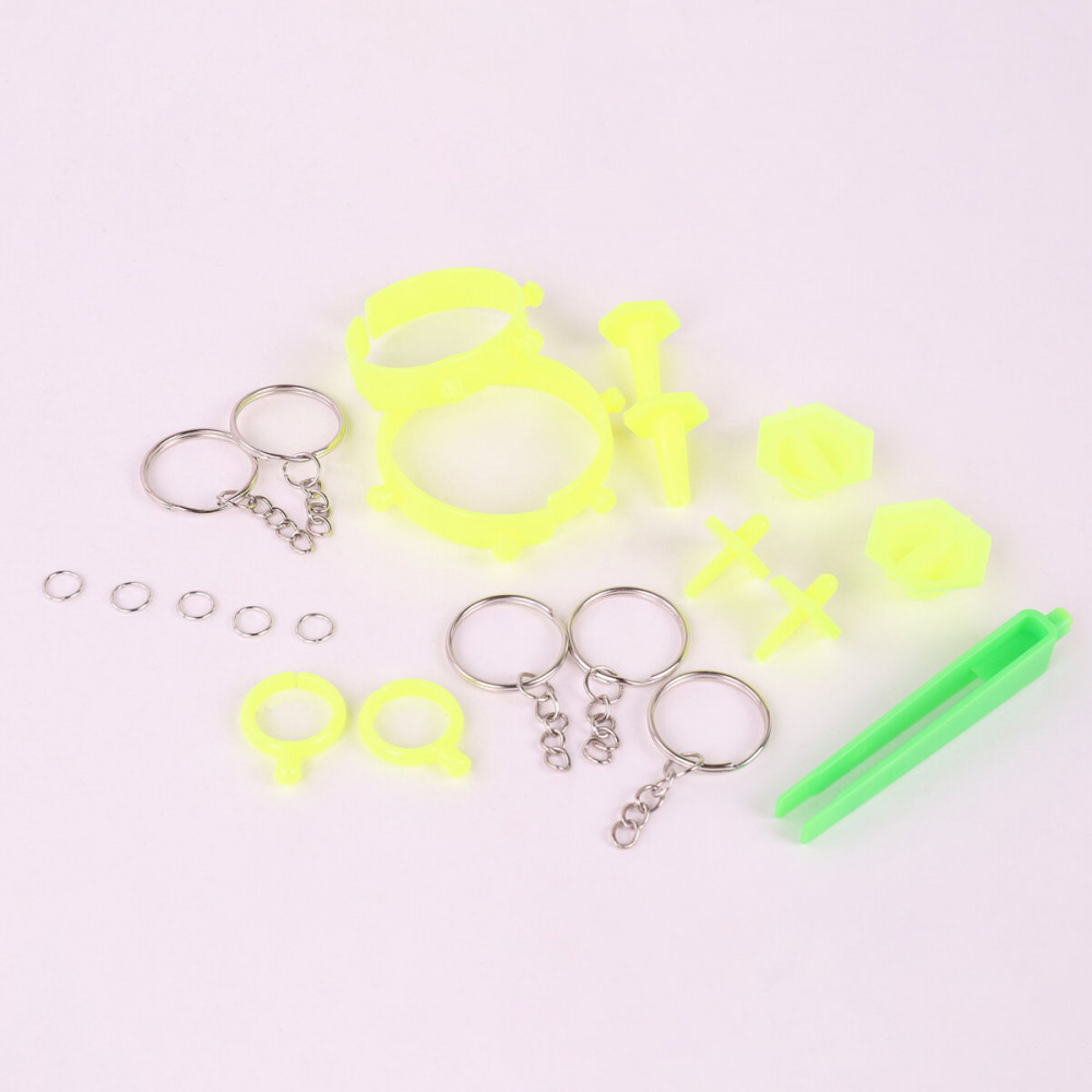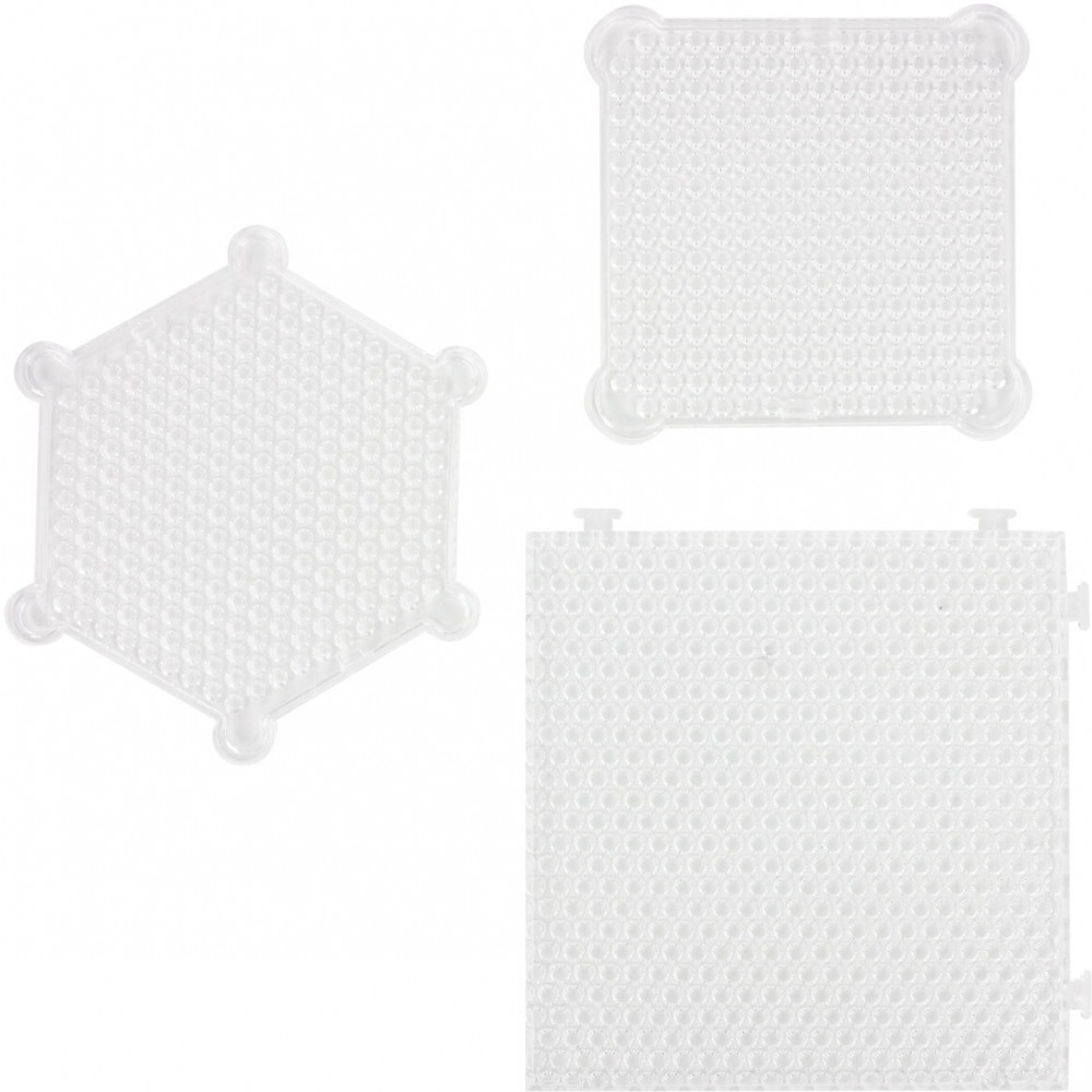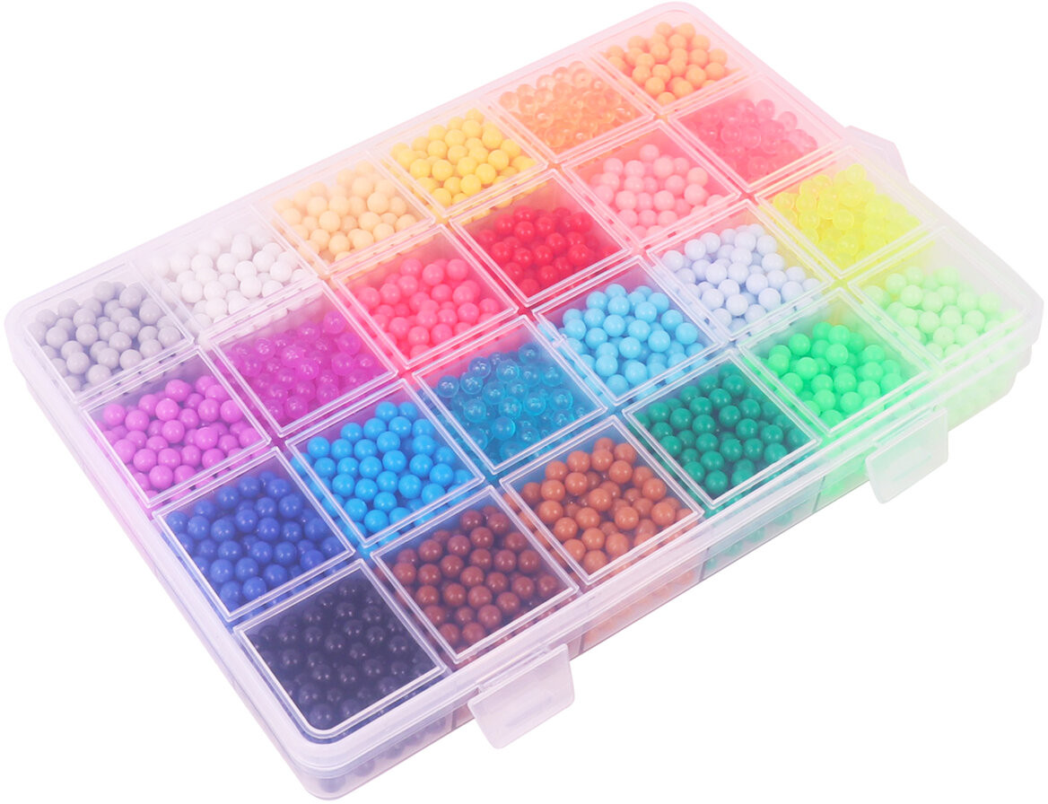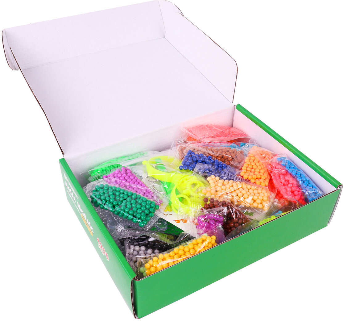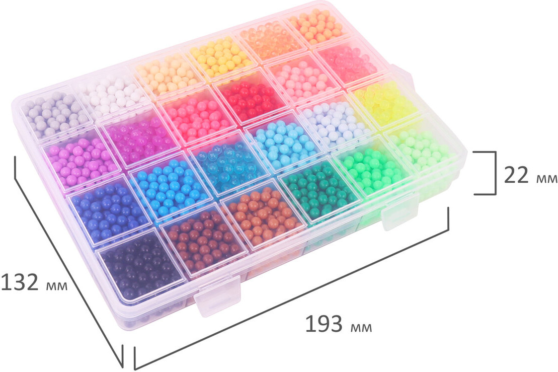 В набор входят бусины 24 различных цветов, около 175 штук каждого цвета, пластиковый контейнер с отсеками для удобного хранения бусин, 3 подставки-трафарета, 16 двусторонних карточек с картинками, бутылочка-пульверизатор для воды, специальная ручка для аквамозаики, лопатка для снятия готовой фигурки с трафарета, а также основы для браслета и других украшений, колечки и крепления для создания брелков, подвесок и других игрушек из бусин. Диаметр одной бусины — 0,5 см.