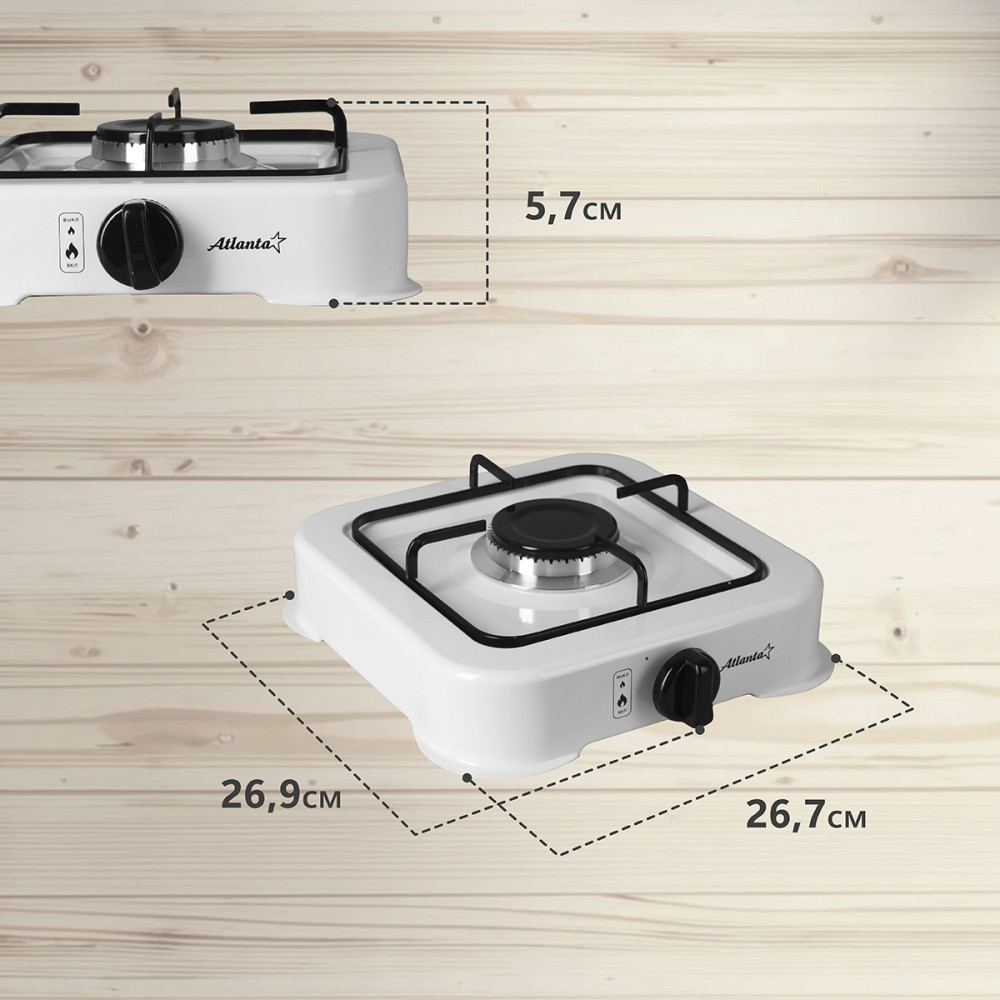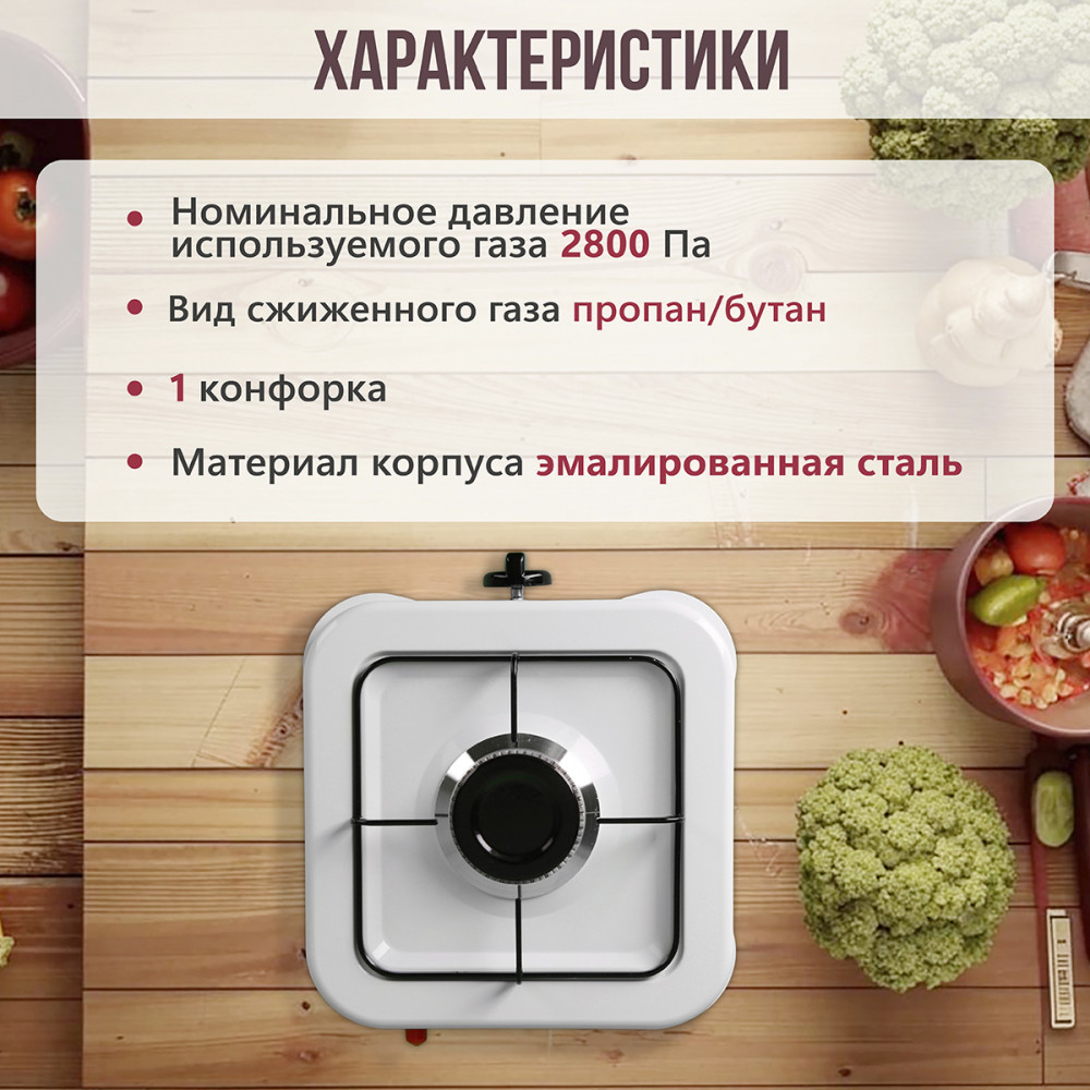 Предназначена для приготовления и разогрева пищи в бытовых условиях, только с бытовыми газовыми баллонами. Эмалированная рабочая поверхность. Цвет эмали: белый. Поворотный механический регулятор пламени конфорки. Возможность присоединения газового шланга с двух сторон. Прибор предназначен для работы только на сжиженном газе с бытовыми газовыми баллонами объемом 5 л, 12 л, 27 л или 50 л (в комплект поставки не входит). Подсоединение газовой плиты к газовому баллону должно осуществляться при помощи регулятора давления газа (редуктора), резинового шланга и хомута.