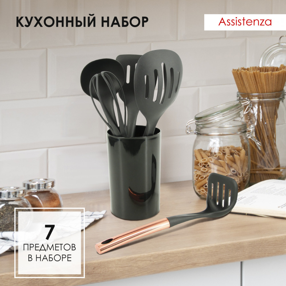 💳 Оплатить за товар можно при получении 🇰🇿 Есть бесплатная доставка по Казахстану 🎁 Копите бонусы с каждой покупки Серия: Assistenza Набор кухонных принадлежностей Pomidoro, 7 предметов. В набор входит половник, лопатка для жарки, толкушка для картофеля, ложка с прорезью для слива масла, шумовка, венчик и удобная подставка для компактного хранения на кухне. Все изделия выполнены из качественного пищевого пластика. Для устранения заводского запаха перед первым применением рекомендуется промыть набор в теплой воде с небольшим количеством моющего средства. Это прекрасный подарок для каждой домохозяйки, мамы, любимой подруги, на день рождения и 8 марта, ведь как говорят итальянские повара — «Sono felice in cucina ed è la cosa più importante!» — «Я счастлив на кухне, и это — самое главное». |