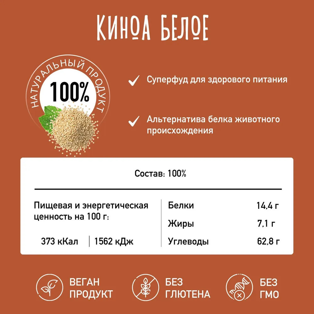 В данный момент этот товар отсутствует в продаже. Возможно, у нас найдется аналогичный или похожий товар здесь. Киноа — это крупа, набирающая популярность среди приверженцев здорового и диетического питания. Белая киноа особенно ценится как продукт без глютена, что делает ее отличным выбором для людей, следящих за своим весом и придерживающихся правильного рациона.