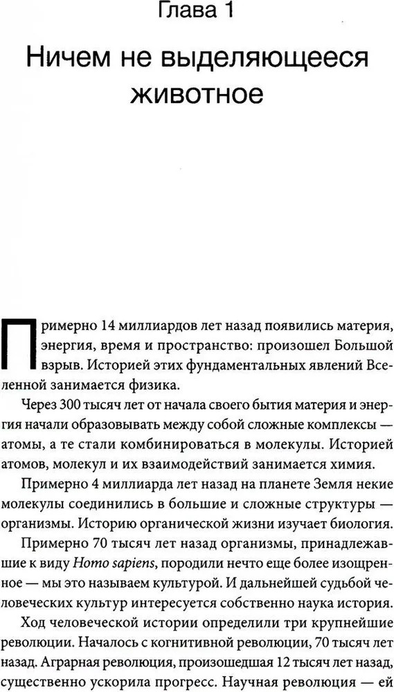 Сто тысяч лет назад Homo sapiens был одним из как минимум шести видов человека, живших на этой планете, — ничем не примечательным животным, которое играло в экосистеме роль не более значительную, чем гориллы, светлячки или медузы. Но около семидесяти тысяч лет назад загадочное изменение когнитивных способностей Homo sapiens превратило его в хозяина планеты и кошмар экосистемы. Как человек разумный сумел покорить мир? Что стало с другими видами человека? Когда и почему появились деньги, государства и религия? Как возникали и рушились империи? Почему почти все общества ставили женщин ниже мужчин? Как наука и капитализм стали господствующими вероучениями современной эры? Становились ли люди с течением времени счастливее? Какое будущее нас ожидает? Юваль Харари показывает, как ход истории формировал человеческое общество и действительность вокруг него. Его книга прослеживает связь между событиями прошлого и проблемами современности и заставляет читателя пересмотреть все устоявшиеся представления об окружающем мире.