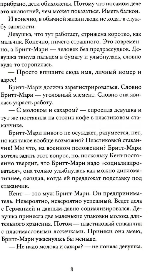 Бритт-Мари — не самый легкий в общении человек. Не то чтобы она была как-то особенно упряма, капризна или придирчива — просто свято уверена, что всегда, везде и во всем должен быть абсолютный порядок. Но весь порядок рушится в одно мгновение, когда Бритт-Мари узнает, что Кент, с которым они сорок лет прожили в образцовом браке, изменил ей. Она принимает удивительное для самой себя решение — собрать чемодан и уехать куда глаза глядят. В захолустном провинциальном городишке с не очень приветливым населением Бритт-Мари придется налаживать новую жизнь. Которая окажется совершенно непохожей на прежнюю.