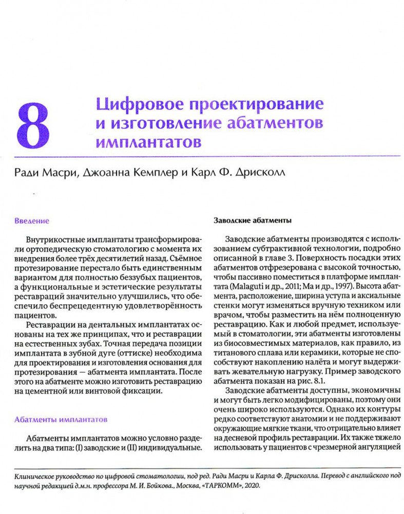 Книга представляет собой компетентный обзор современных цифровых технологий и протоколов, используемых в клинической практике. Описываются показания и противопоказания, преимущества и недостатки, ограничения и варианты использования цифровых технологий во всех областях стоматологии. В издании представлены разделы о различных вариантах использования современных цифровых технологий с практической точки зрения — в работе с системами визуализации, получении оттисков, оперативной стоматологии, эндодонтии, ортодонтии, челюстно-лицевой хирургии, планировании имплантации и последующей ортопедической реабилитации, в том числе и с индивидуально изготавливаемыми протетическими конструкциями. Книга будет интересна не только студентам и ординаторам, но и практикующим врачам-стоматологам, задумывающимся о внедрении цифровых технологий в свою клиническую практику. |