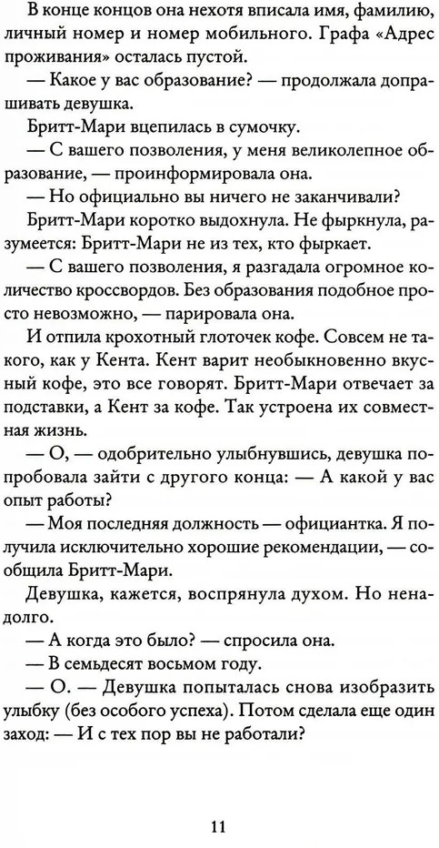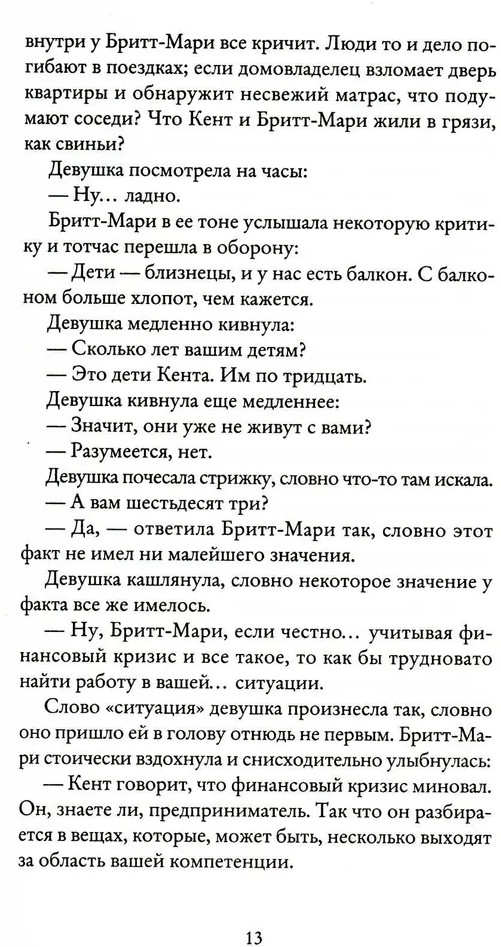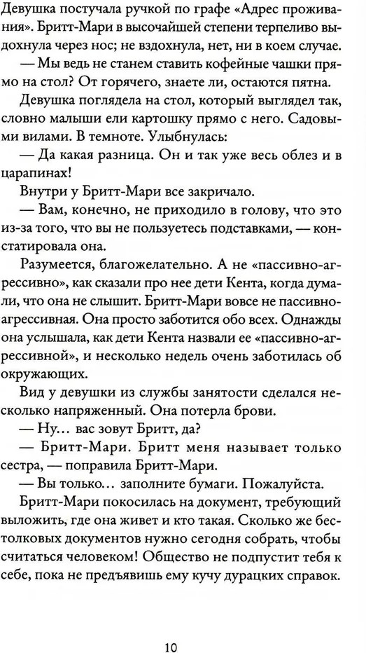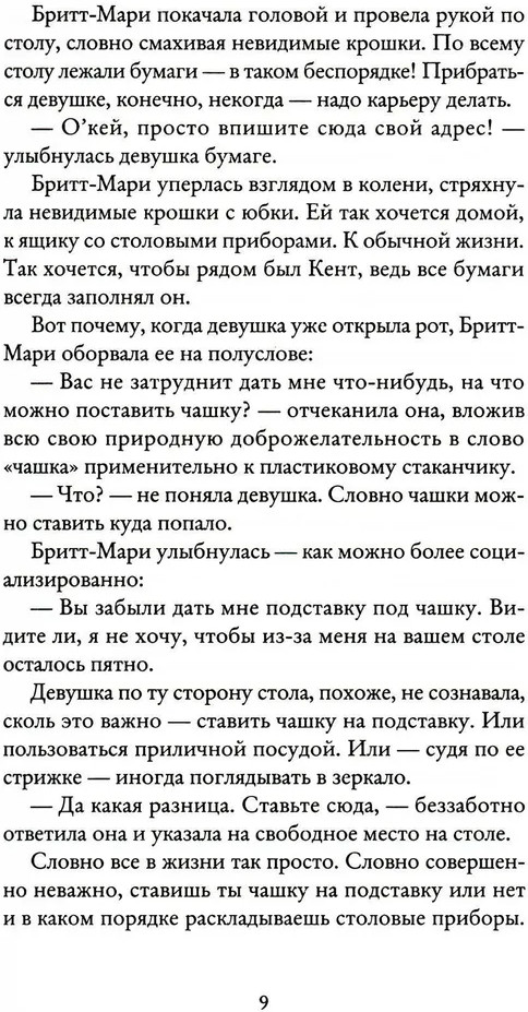 Бритт-Мари — не самый легкий в общении человек. Не то чтобы она была как-то особенно упряма, капризна или придирчива — просто свято уверена, что всегда, везде и во всем должен быть абсолютный порядок. Но весь порядок рушится в одно мгновение, когда Бритт-Мари узнает, что Кент, с которым они сорок лет прожили в образцовом браке, изменил ей. Она принимает удивительное для самой себя решение — собрать чемодан и уехать куда глаза глядят. В захолустном провинциальном городишке с не очень приветливым населением Бритт-Мари придется налаживать новую жизнь. Которая окажется совершенно непохожей на прежнюю. |