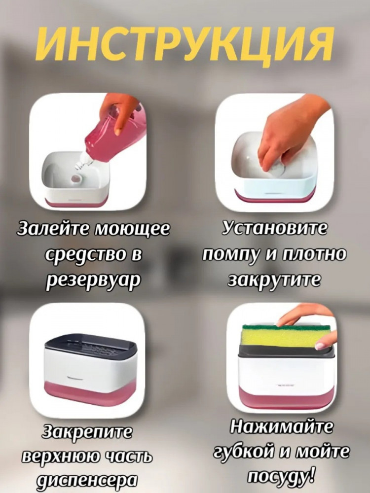 Практичность и удобство на кухне станут неотъемлемыми с дозатором для моющего средства. Этот стильный аксессуар оснащён держателем для губки, что позволяет легко организовать пространство. Диспенсер идеально подходит для упрощения процесса мытья посуды. Разместив его на мойке, вы получите органайзер для губки и моющих средств, поддерживающий порядок.