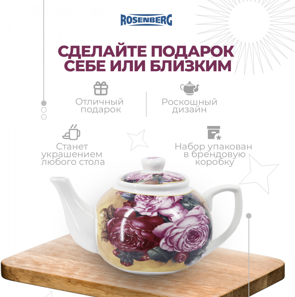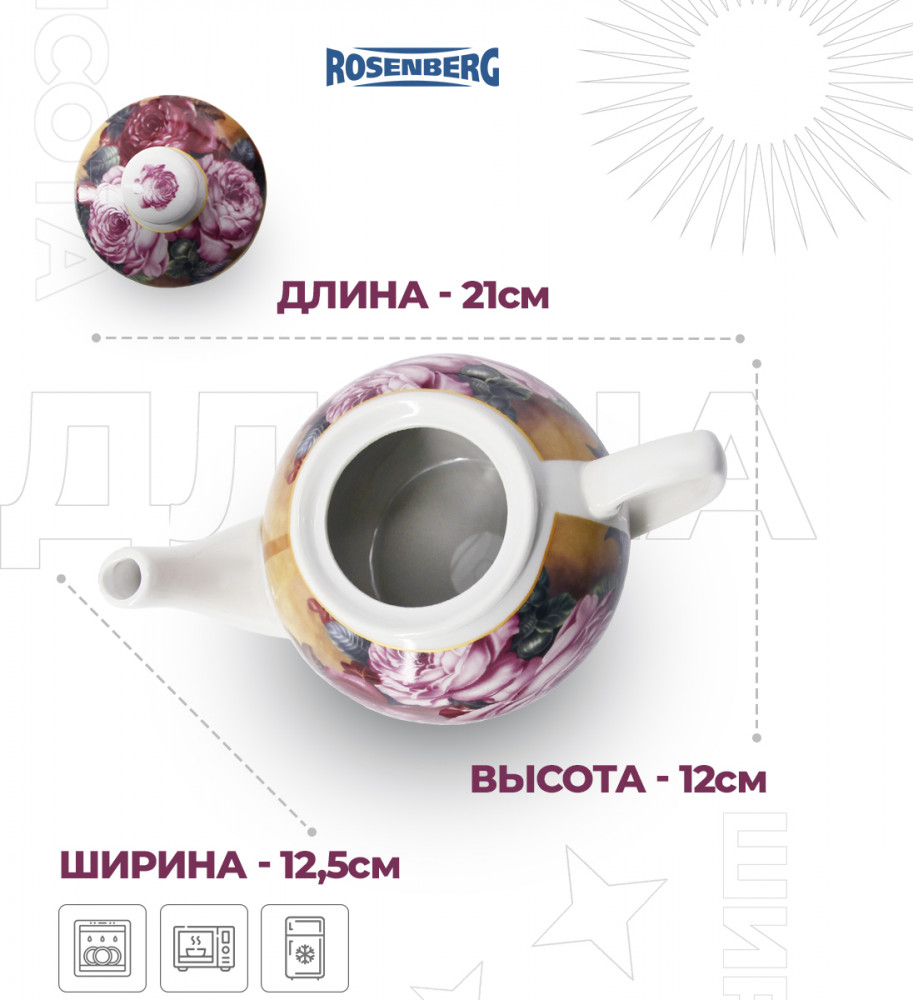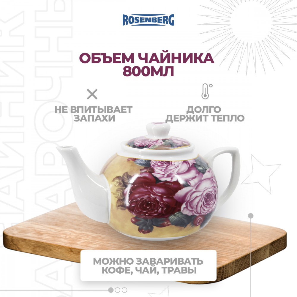 Rosenberg Чайник заварочныйВ данный момент этот товар отсутствует в продаже. Возможно, у нас найдется аналогичный или похожий товар здесь. Чайник заварочный объемом 800 мл выполнен из высококачественной керамики. Чайник отличается оригинальным дизайном, изящной формой, удобной ручкой и носиком. Керамика — это экологически чистый материал, который не выделяет запаха и вредных веществ при нагреве. Заварочный чайник подарит вам незабываемые эмоции во время чаепитий. |