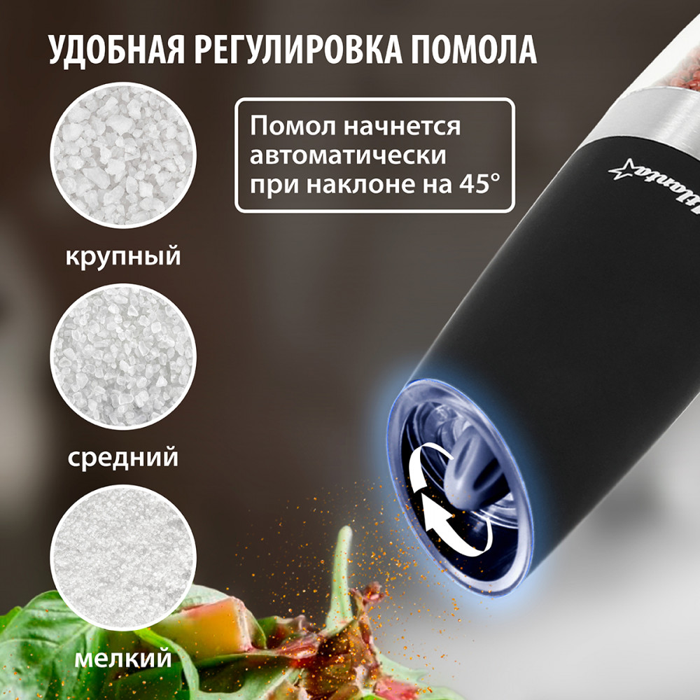💳 Оплатить за товар можно при получении 🇰🇿 Есть бесплатная доставка по Казахстану от 1 дня 🎁 Копите бонусы с каждой покупки Мельница для специй электрическая гравитационная Atlanta — не только полезный и стильный аксессуар для кухни, но и отличный подарок на любой праздник. Корпус перечницы электрической выполнен в эргономичной форме, имеет матовое soft-touch покрытие, внутри установлен долговечный и надежный керамический механизм. Электромельница оснащена автоматическим включением при наклоне корпуса, яркой светодиодной подсветкой и регулировкой степени помола. Работает от 6 х ААА батареек. Мельница для соли и перца удачно впишется в интерьер любой современной кухни. Благодаря перцемолке Atlanta качественный и быстрый помол любых специй вам гарантирован. |