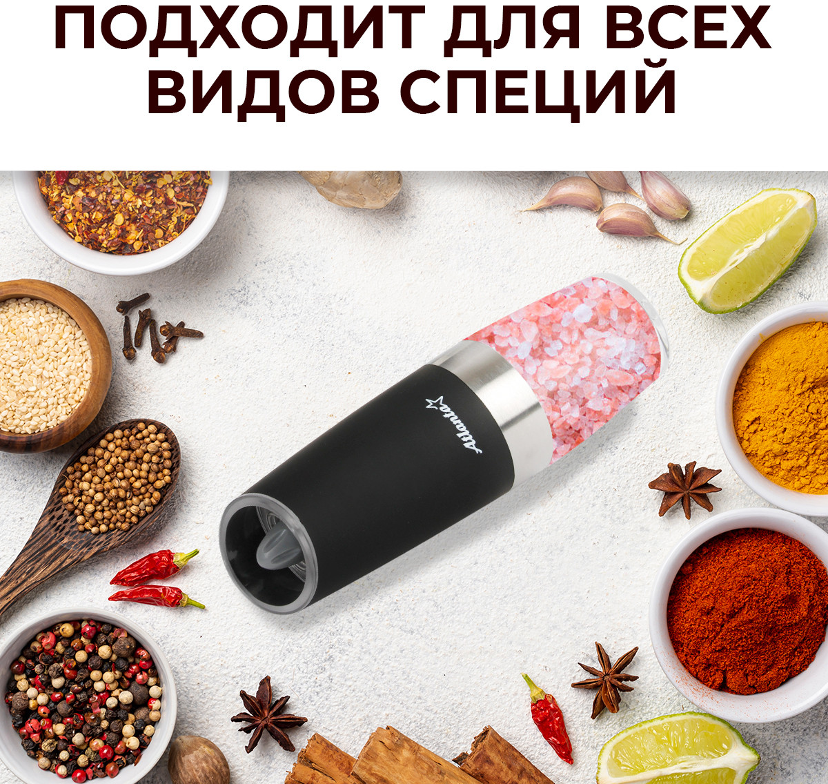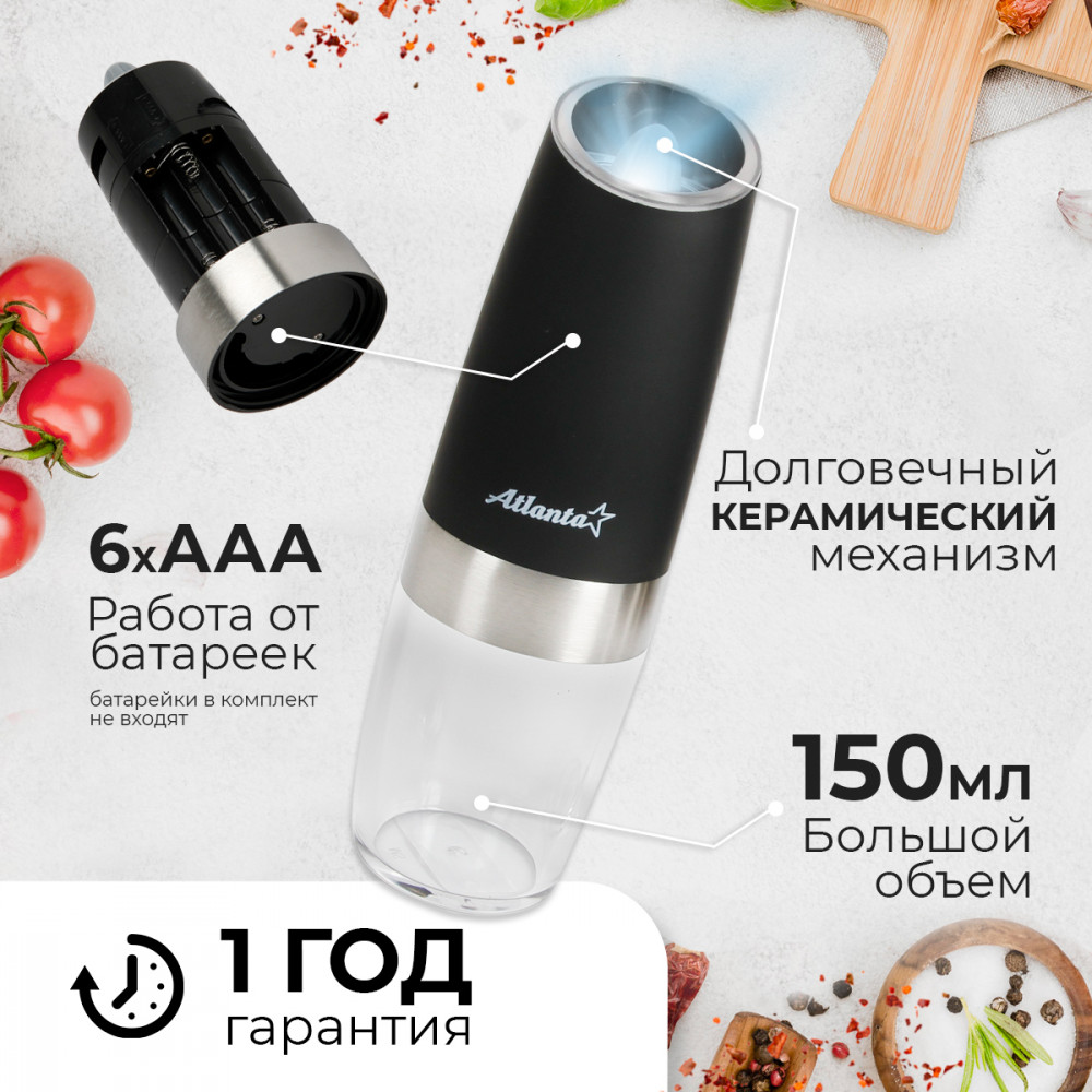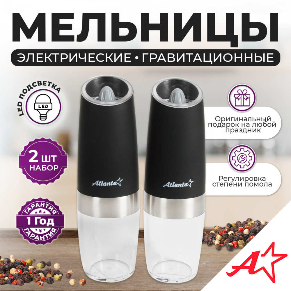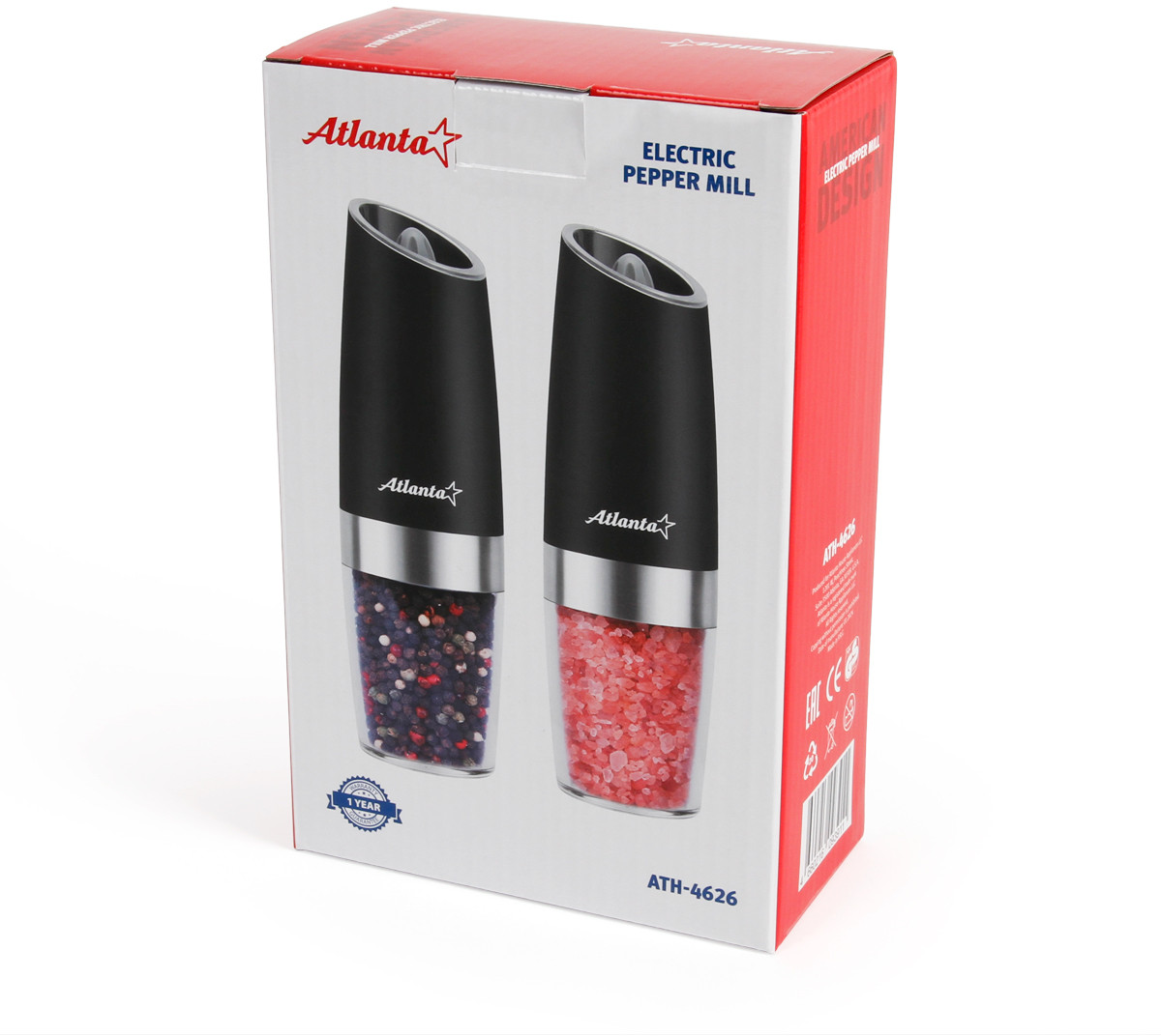 Набор из двух мельниц электрических гравитационных Atlanta выполнены в стильном минималистичном дизайне. полезный и стильный аксессуар для вашей кухне. Гравитационные перцемолки оснащены автоматическим включением при наклоне корпуса, яркой светодиодной подсветкой и регулировкой степени помола.Буквально за несколько секунд, без каких-либо усилий вы сможете перемолоть перец, крупную соль и другие специи. Благодаря свежим специям каждое блюдо, которое вы готовите, наполнится своим неповторимым, насыщенным вкусом и оттенком. Готовьте с электромельницами Atlanta и удивляйте своими кулинарными шедеврами родных и близких.