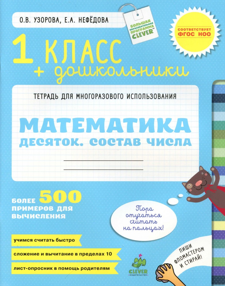 Математика. Десяток. Состав числа. 1 класс и дошкольникиОльга Васильевна Узорова, Елена Алексеевна Нефедова В данный момент этот товар отсутствует в продаже. Возможно, у нас найдется аналогичный или похожий товар здесь. Серия: Узорова О., Нефедова Е. Многоразовые тетради по основным предметам Тетрадь для многоразового использования «Математика. 1 класс и дошкольники. Десяток. Состав числа. Более 500 примеров для вычисления» может стать одной из первых обучающих тетрадей для вашего ребенка. Ориентирована тетрадь на детей 4-7 лет, готовящихся к школе, и на первоклассников. Тетрадь содержит игровые задания и более 500 примеров на вычисление. Тетрадь – многоразовая: каждая страничка имеет специальное покрытие, на котором можно писать фломастером, а затем всё стереть … И делать это еще и еще раз, пока состав числа 10 не будет ребёнком полностью усвоен, а счёт не станет безошибочным и не дойдет до автоматизма. |