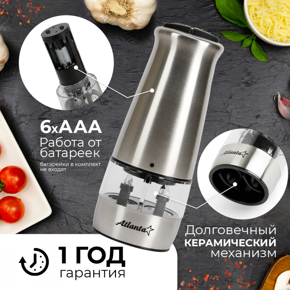 💳 Оплатить за товар можно при получении 🇰🇿 Есть бесплатная доставка по Казахстану от 1 дня 🎁 Копите бонусы с каждой покупки Мельница электрическая для специй Atlanta, двухсторонняя, 2 контейнера для соли и специй. Двусторонняя перцемолка Atlanta станет полезным и стильным аксессуаром на вашей кухне. Буквально за несколько секунд, без каких-либо усилий вы сможете перемолоть перец, крупную соль и другие специи. Благодаря свежим специям каждое блюдо, которое вы готовите, наполнится своим неповторимым, насыщенным вкусом и оттенком. Внутри перцемолки установлен надежный керамический механизм, корпус выполнен из нержавеющей стали. Готовьте с электромельницей Atlanta и удивляйте своими кулинарными шедеврами родных и близких. |