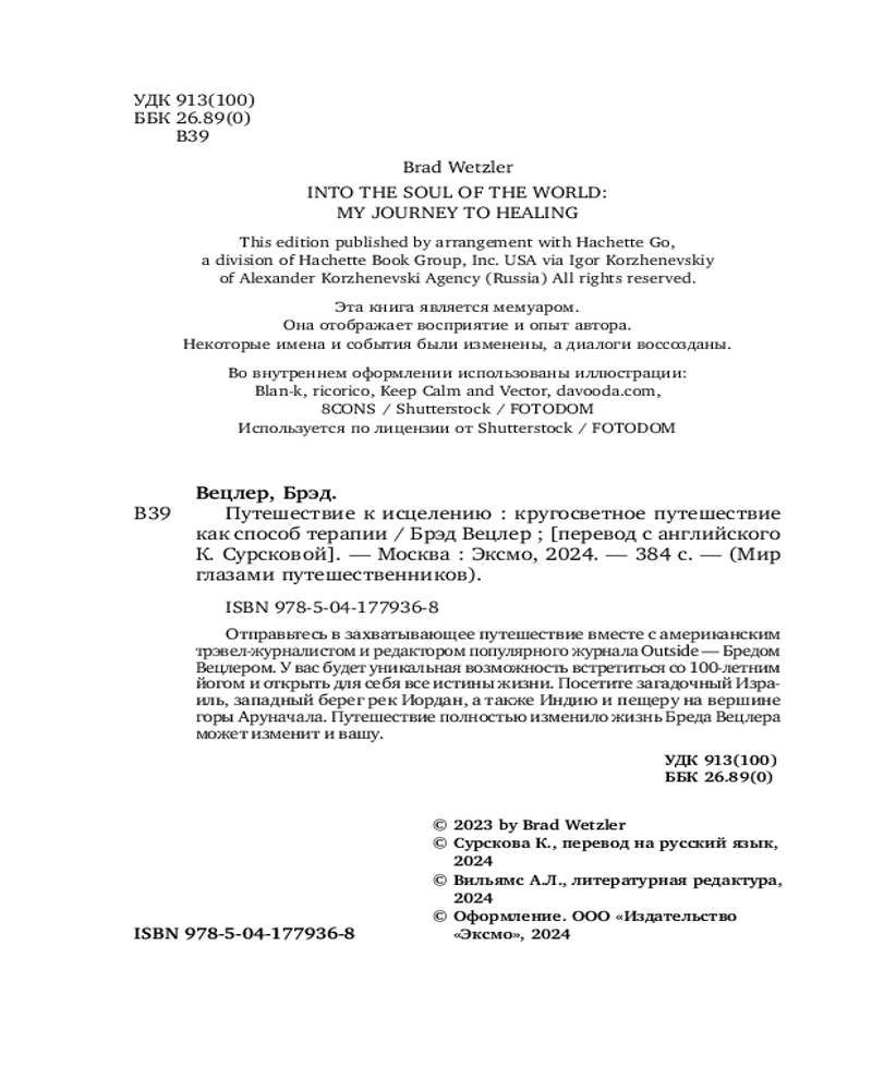 💳 Оплатить за товар можно при получении 🇰🇿 Есть бесплатная доставка по Казахстану от 1 дня 🎁 Копите бонусы с каждой покупки Серия: Мир глазами путешественников Впервые в России мемуары Брэда Вецлера — редактора популярного американского журнала о природе Outside. Именно он отправил в трагическую экспедицию на Эверест писателя и журналиста Джона Кракауэра, автора бестселлера «В разреженном воздухе», о чем и рассказывает в своей книге. Вы узнаете о пути, который прошел автор, чтобы найти смысл жизни, о путешествиях по самым священным местам мира и, конечно, о забавных приключениях. У вас будет уникальная возможность встретиться со 100-летним йогом и понять, что же такое внутреннее счастье. Трудное детство, проблемы с родителями, неудача в браке и потеря карьеры не сломали Брэда Вецлера, а подтолкнули к главному решению всей жизни — отправиться на другой край света. Путешествие помогло ему полностью исцелиться и изменить жизнь к лучшему. Окунитесь в мир приключений вместе с автором! |