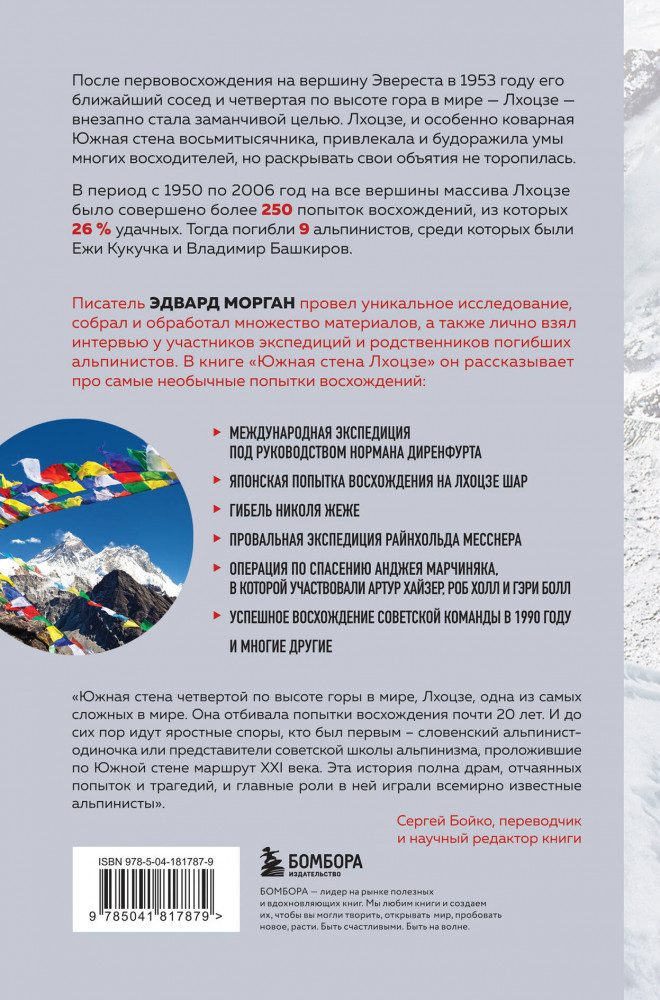 💳 Оплатить за товар можно при получении 🇰🇿 Есть бесплатная доставка по Казахстану от 1 дня 🎁 Копите бонусы с каждой покупки Серия: Мир адреналина. Книги про экстремальный спорт После первовосхождения на вершину Эвереста в 1953 году его ближайшая соседка и четвертая по высоте гора в мире — Лхоцзе (8516 м) — внезапно стала привлекательной целью. Лхоцзе, и особенно коварная Южная стена восьмитысячника, будоражила умы многих восходителей, но была неприступна почти 20 лет. |