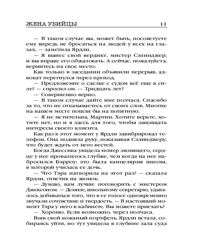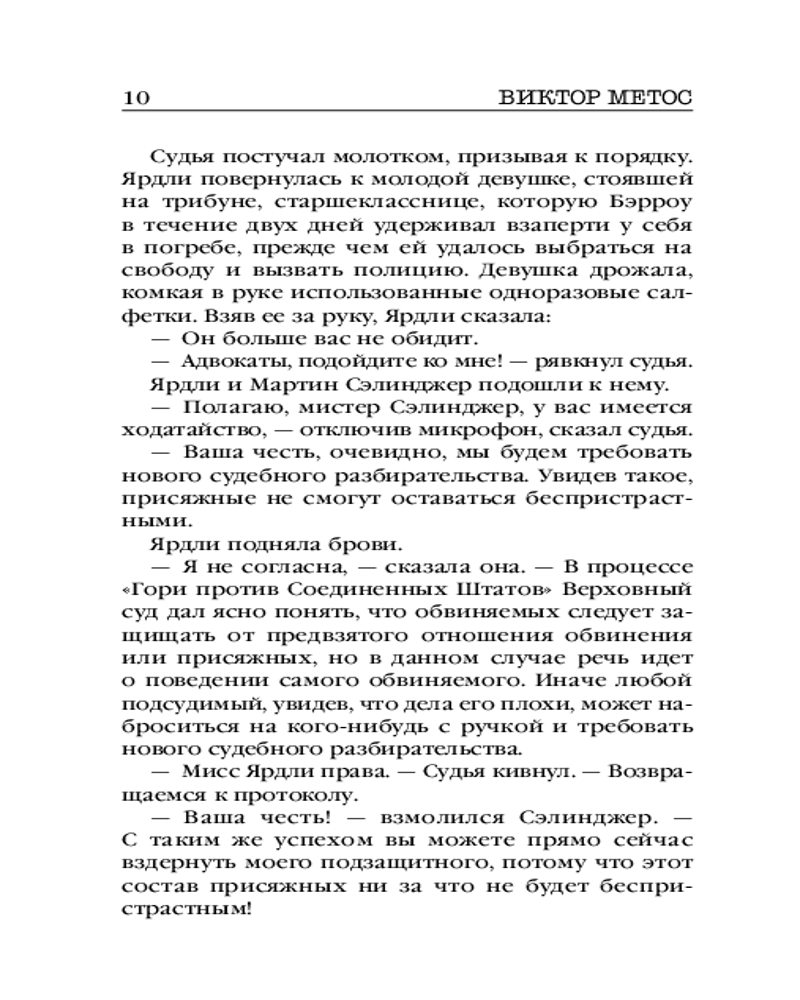Мне не понравилась книга. Читала неделю. Первые 120 страниц рассуждения на тему «как же я буду жить, если откажусь от этого дела, тогда я не смогу работать в юриспруденции». На мой взгляд много нестыковок, нелогичных действий, нудное судебное разбирательство . Прокурор выходит в суд без конкретных улик, тюрьма просто проходной двор. А конец ни к селу ни к городу, думаю, автор придумал в последний момент, решив написать продолжение. На любителя