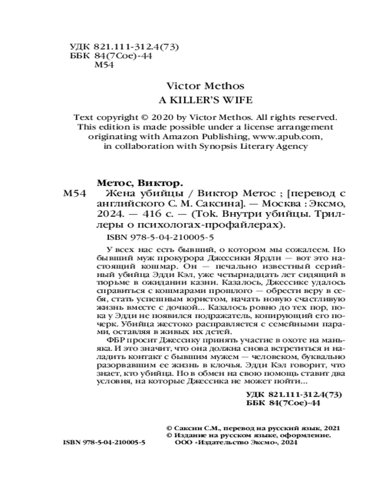 Жена убийцыВ данный момент этот товар отсутствует в продаже. Возможно, у нас найдется аналогичный или похожий товар здесь. Серия: Tok. Внутри убийцы. Триллеры о психологах-профайлерах (обложка) Узнала одного — знаешь их всех... Этот захватывающий триллер — идеальная смесь «Мертвого озера» Рейчел Кейн и «Внутри убийцы» Майка Омера. Федеральный прокурор вынуждена бороться с жуткими подробностями своего прошлого — и одновременно с худшими страхами перед будущим. |