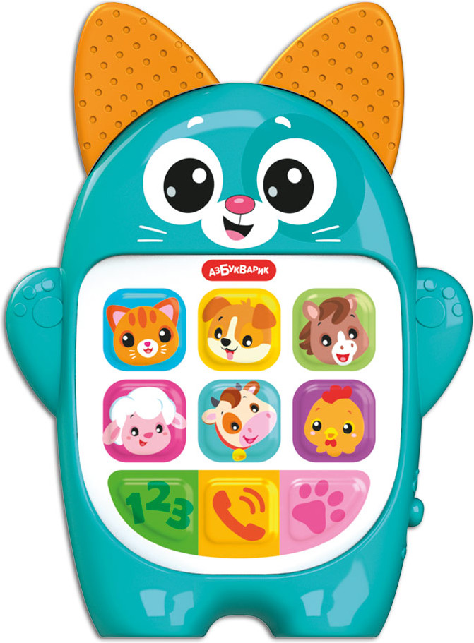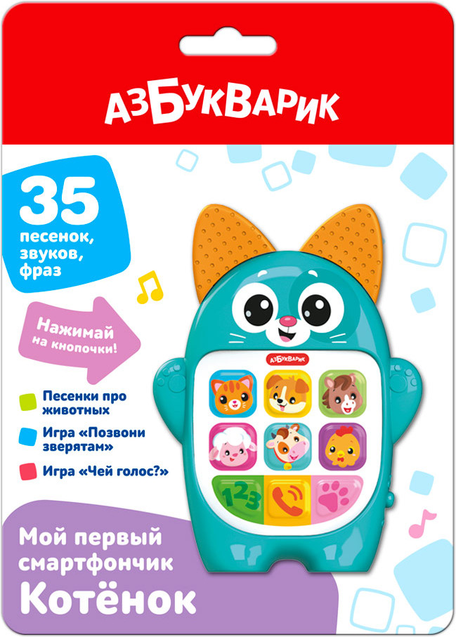 Азбукварик Игрушка музыкальная «Котёнок»В данный момент этот товар отсутствует в продаже. Возможно, у нас найдется аналогичный или похожий товар здесь. Серия: Мой первый смартфончик Необычный музыкальный смартфончик для малыша — в виде забавного Котёнка! Нажимая на кнопочки, ребёнок послушает песенки про животных фермы и поиграет в увлекательные игры. Игра «Позвони зверятам» — малыш сможет позвонить Котёнку и его друзьям, и зверюшки ответят ему. А во второй игре — «Угадывай зверятам по голосам» — ребенок узнает по звуку щенка, курочку, лошадку, овечку, коровку и котика. Весёлые песенки-обучалочки помогут маленькому умнику научиться считать до 5, познакомят с основными цветами и формами. |