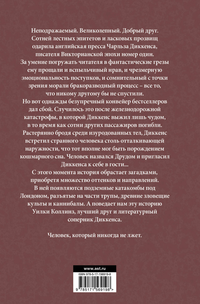 💳 Оплатить за товар можно при получении 🇰🇿 Есть бесплатная доставка по Казахстану от 1 дня 🎁 Копите бонусы с каждой покупки Серия: Мастера фантазии Неподражаемый. Великолепный. Добрый друг. Сотней лестных эпитетов и ласковых прозвищ одарила английская пресса Чарльза Диккенса, писателя викторианской эпохи номер один. За умение погружать читателя в фантастические грезы ему прощали и вспыльчивый нрав, и чрезмерную эмоциональность поступков, и сомнительный с точки зрения морали бракоразводный процесс — всё то, что никому другому бы не спустили. Но вот однажды безупречный конвейер бестселлеров дал сбой. Случилось это после железнодорожной катастрофы, в которой Диккенс выжил лишь чудом, в то время как сотни других пассажиров погибли. Растерянно бродя среди изуродованных тел, Диккенс встретил странного человека столь отталкивающей наружности, что тот вполне мог быть порождением кошмарного сна. Человек назвался Друдом и пригласил Диккенса к себе в гости... |