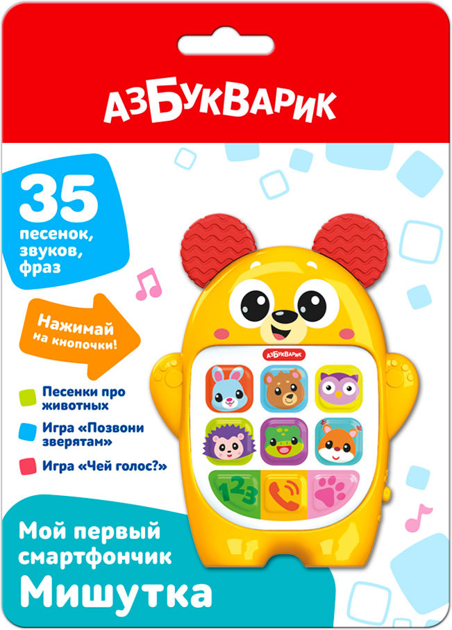 Азбукварик Игрушка музыкальная «Мишутка»В данный момент этот товар отсутствует в продаже. Возможно, у нас найдется аналогичный или похожий товар здесь. Серия: Мой первый смартфончик Необычный музыкальный смартфончик для малыша – в виде забавного Мишутки! Нажимая на кнопочки, ребёнок послушает песенки про лесных животных и поиграет в увлекательные игры. Игра «Позвони зверятам» – малыш сможет позвонить Мишутке и его друзьям, и зверюшки ответят ему. А во второй игре – «Угадывай зверятам по голосам» – ребенок узнает по звуку зайчика, сову, ёжика, лягушку, белочку и мишку. Весёлые песенки-обучалочки помогут маленькому умнику научиться считать до 5, познакомят с основными цветами и формами. |