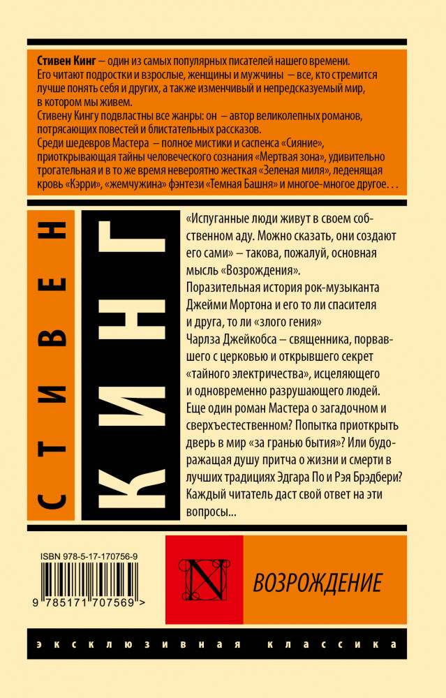 💳 Оплатить за товар можно при получении 🇰🇿 Есть бесплатная доставка по Казахстану от 1 дня 🎁 Копите бонусы с каждой покупки Серия: Эксклюзивная классика «Испуганные люди живут в своем собственном аду. Можно сказать, они создают его сами» — такова, пожалуй, основная мысль «Возрождения». Поразительная история рок-музыканта Джейми Мортона и его то ли спасителя и друга, то ли «злого гения» Чарлза Джейкобса — священника, порвавшего с церковью и открывшего секрет «тайного электричества», исцеляющего и одновременно разрушающего людей. Еще один роман Мастера о загадочном и сверхъестественном? Попытка приоткрыть дверь в мир «за гранью бытия»? Или будоражащая душу притча о жизни и смерти в лучших традициях Эдгара По и Рэя Брэдбери? Каждый читатель даст свой ответ на эти вопросы... |