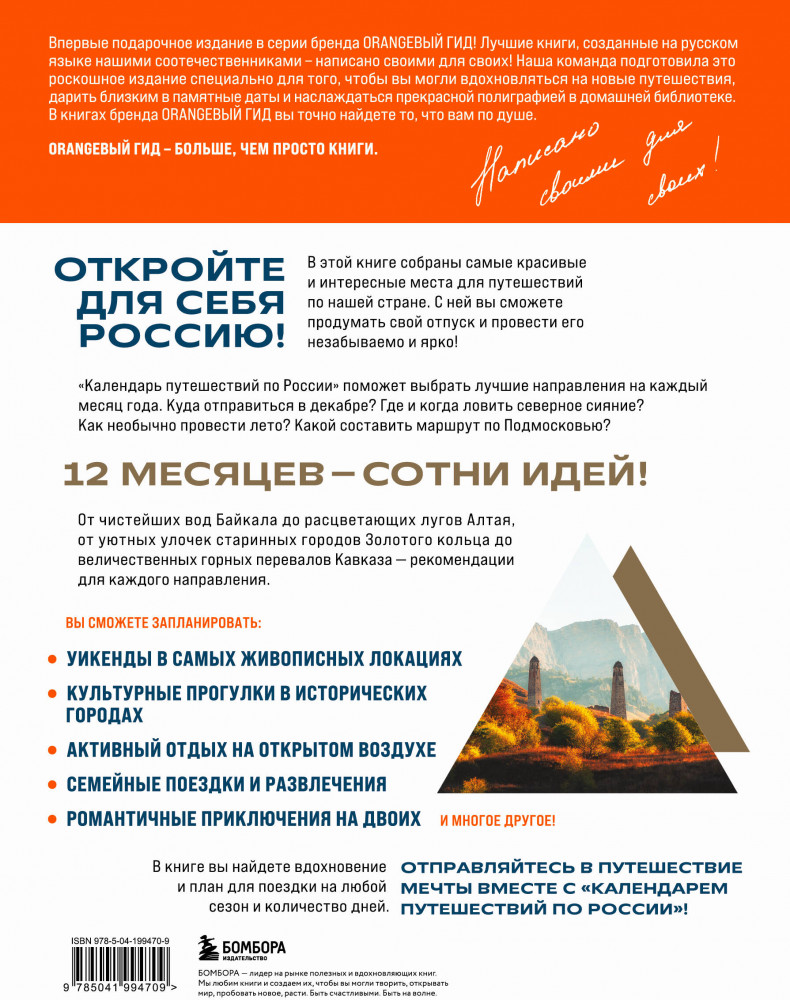 Серия: Подарочные издания. Оранжевый гид Путешествуйте по России круглый год вместе с «Календарем путешествий по России»! Эта уникальная книга станет вашим личным гидом и источником вдохновения для планирования самых запоминающихся поездок по нашей невероятной стране.