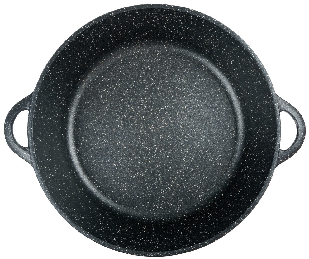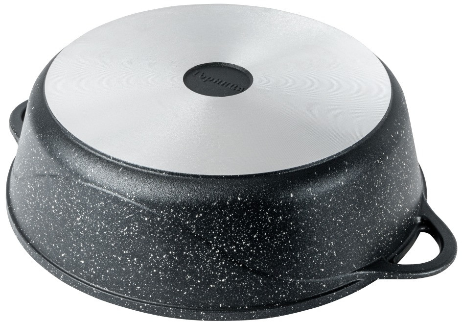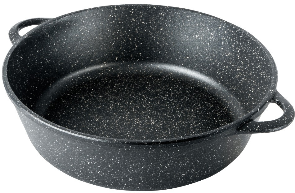 Литая алюминиевая жаровня с антипригарным покрытием подходит для газовых, электрических и стеклокерамических плит. Это разновидность сковороды с двумя ручками и широким дном. Жаровня имеет важное преимущество; в ней можно готовить не только на плите, но в духовом шкафу. Алюминиевая посуда данной категории подходит для жарки, пассеровки, тушения, для выпечки хлеба, а также для запекания блюд. Коллекция «мраморной посуды» с улучшенным четырёхслойным антипригарным покрытием. Дополнительный слой с мраморным эффектом увеличивает износостойкость и создаёт оригинальный оттенок чёрного мрамора. Толстые стенки и утолщенное дно жаровни способствуют равномерному распределению тепла по рабочей поверхности. Антипригарное покрытие на водной основе лишено вредных химических соединений, экологично и безопасно. Как и кастрюля антипригарная, жаровня имеет литые ручки. Это позволяет использовать для приготовления блюд электрический духовой шкаф, а также газовый духовой шкаф.