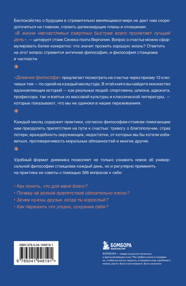 Очень хорошая вещь. Действительно интересные вопросы для себя, и видно, что авторы хорошо, далеко не поверхностно, понимают философию стоицизма, видят в ней смысл и пользу, и делятся ей таким эргономичным образом со всеми страждущими. Советую приобрести дневник для вечерних размышлений.