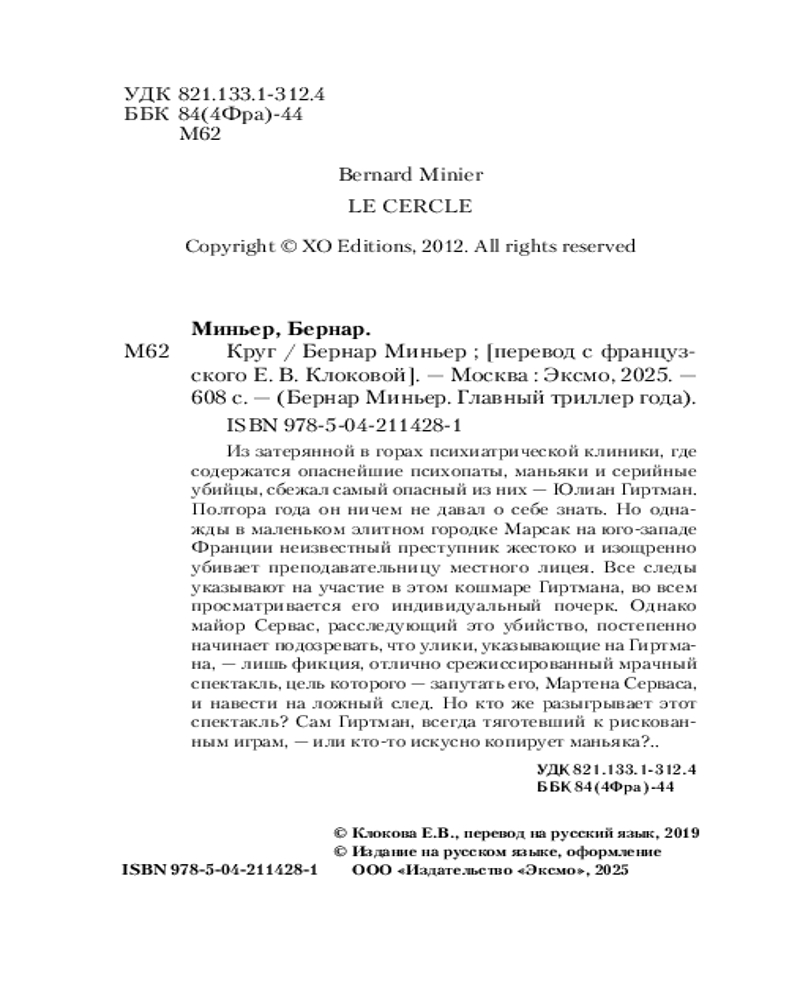 💳 Оплатить за товар можно при получении 🇰🇿 Есть бесплатная доставка по Казахстану от 1 дня 🎁 Копите бонусы с каждой покупки Серия: Бернар Миньер. Главный триллер года (обложка) Этим романом Миньер окончательно закрепил за собой репутацию автора № 1 французского триллера и живого классика жанра. Его книги о Мартене Сервасе изданы во Франции тиражом более 3 миллионов экземпляров и переведены более чем на 20 языков, а компания Netflix сняла по ним сериал. |